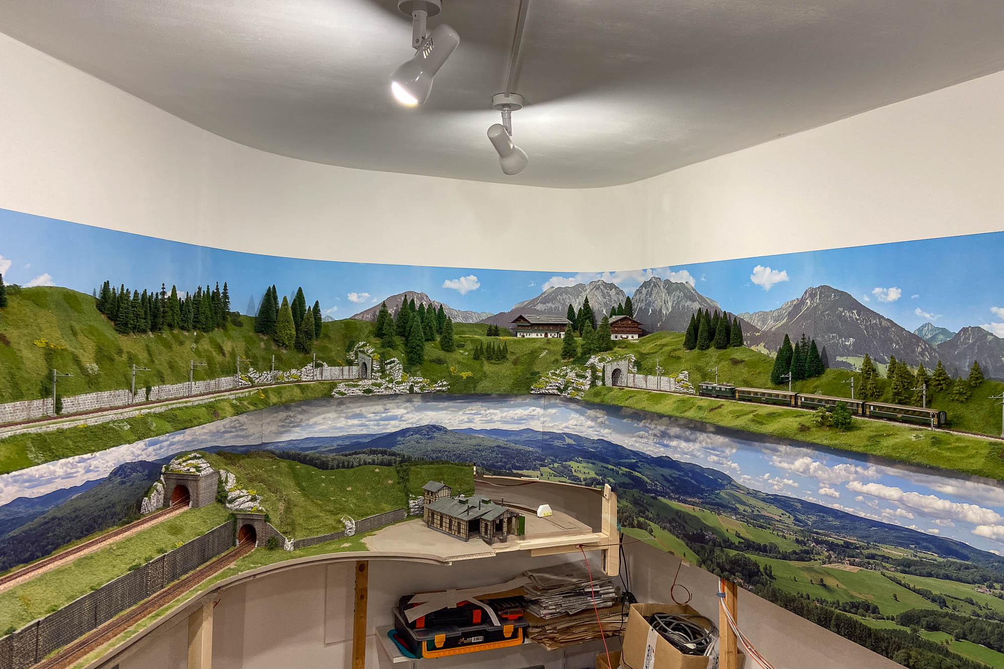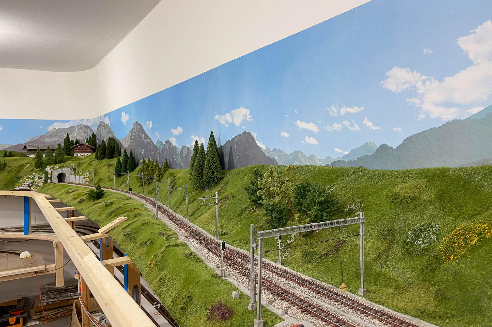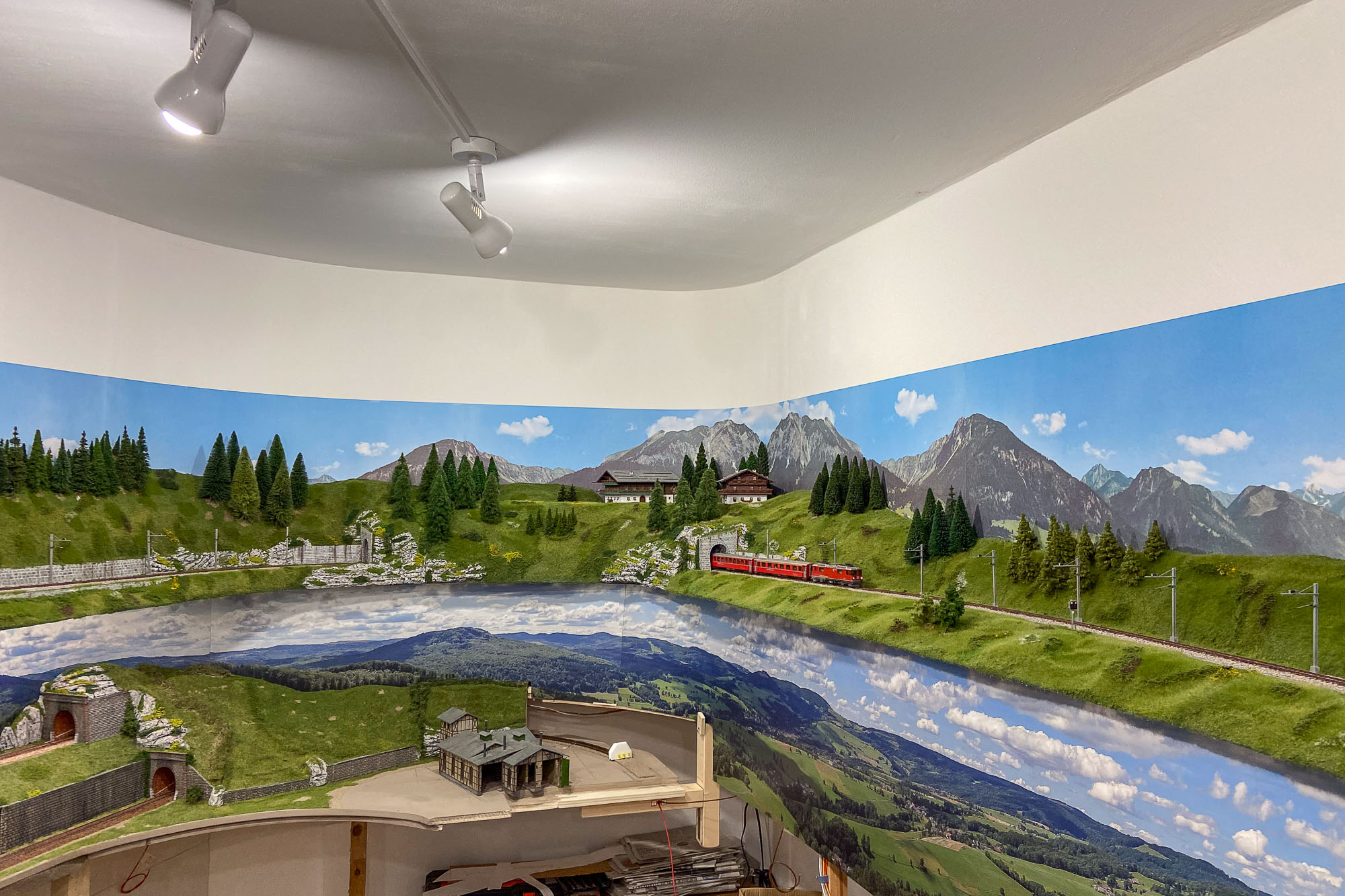 Utilizzando uno sfondo commerciale, per raggiungere gli oltre 17 metri del perimetro della mia stanza ho dovuto impiegare ben 6 elementi e quindi le montagne, i prati, le nuvole… si ripetono 6 volte. Inoltre il punto di congiunzione non è stato ben studiato da Faller producendo delle simmetrie poco realistiche.
