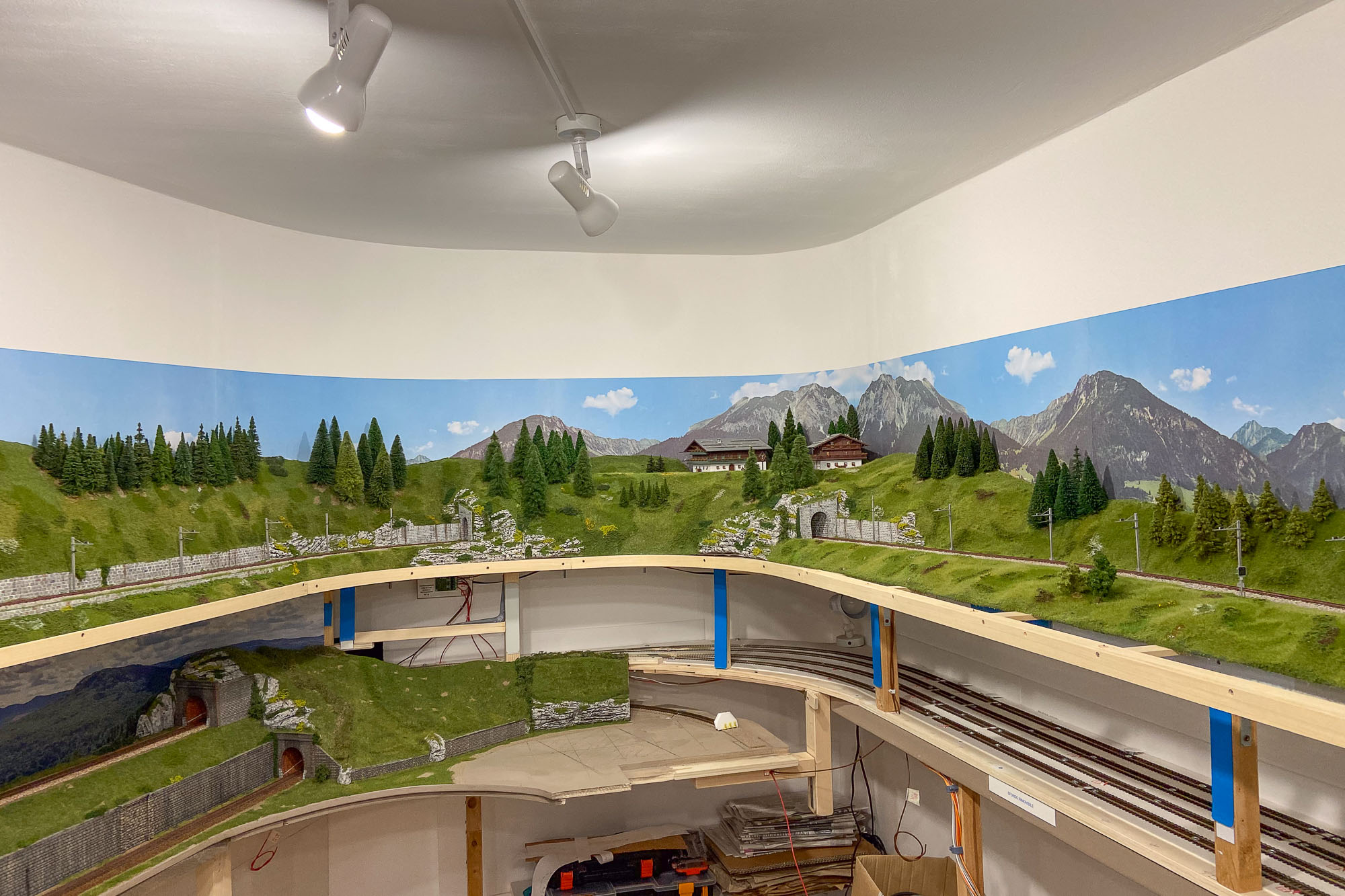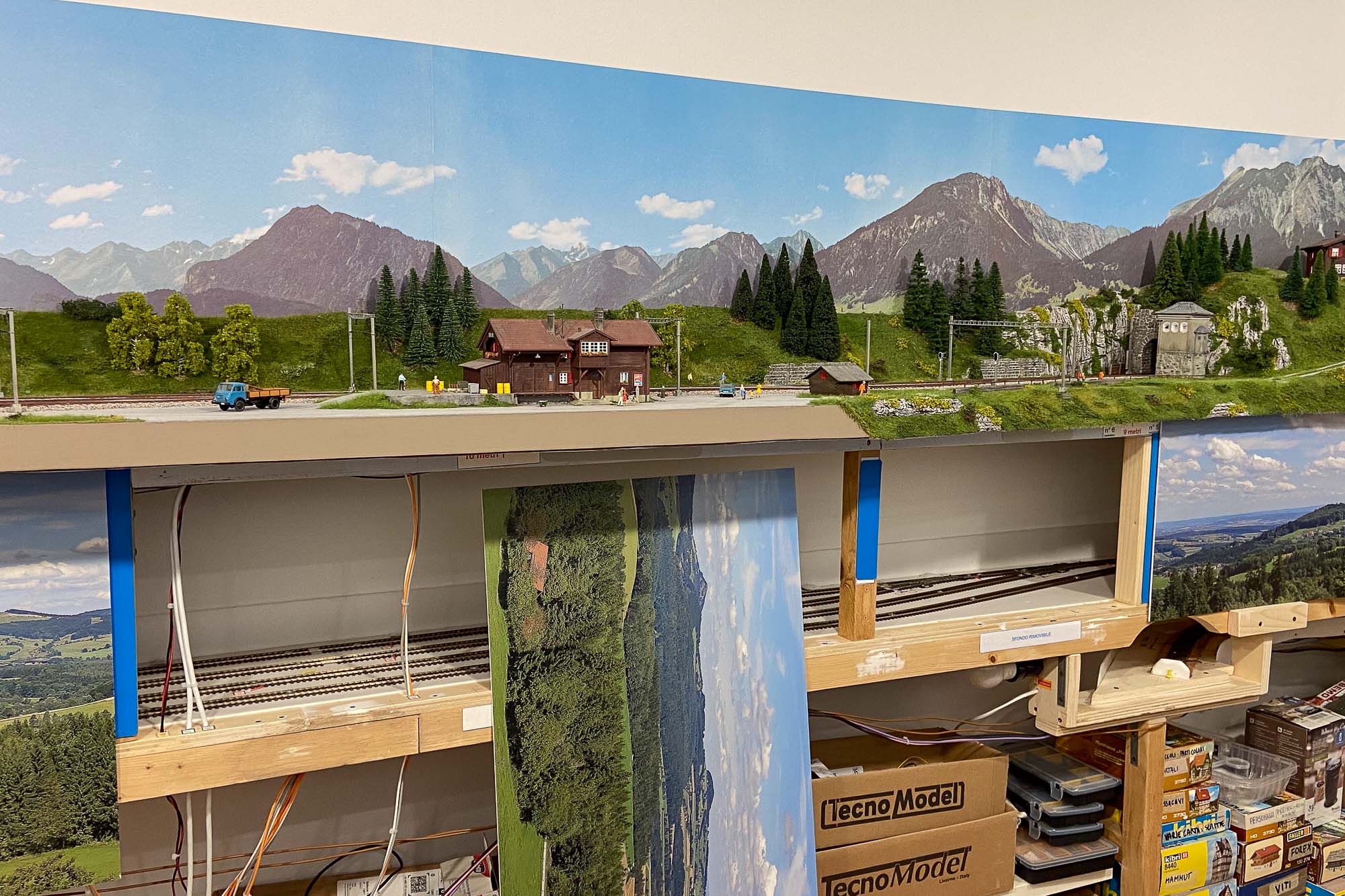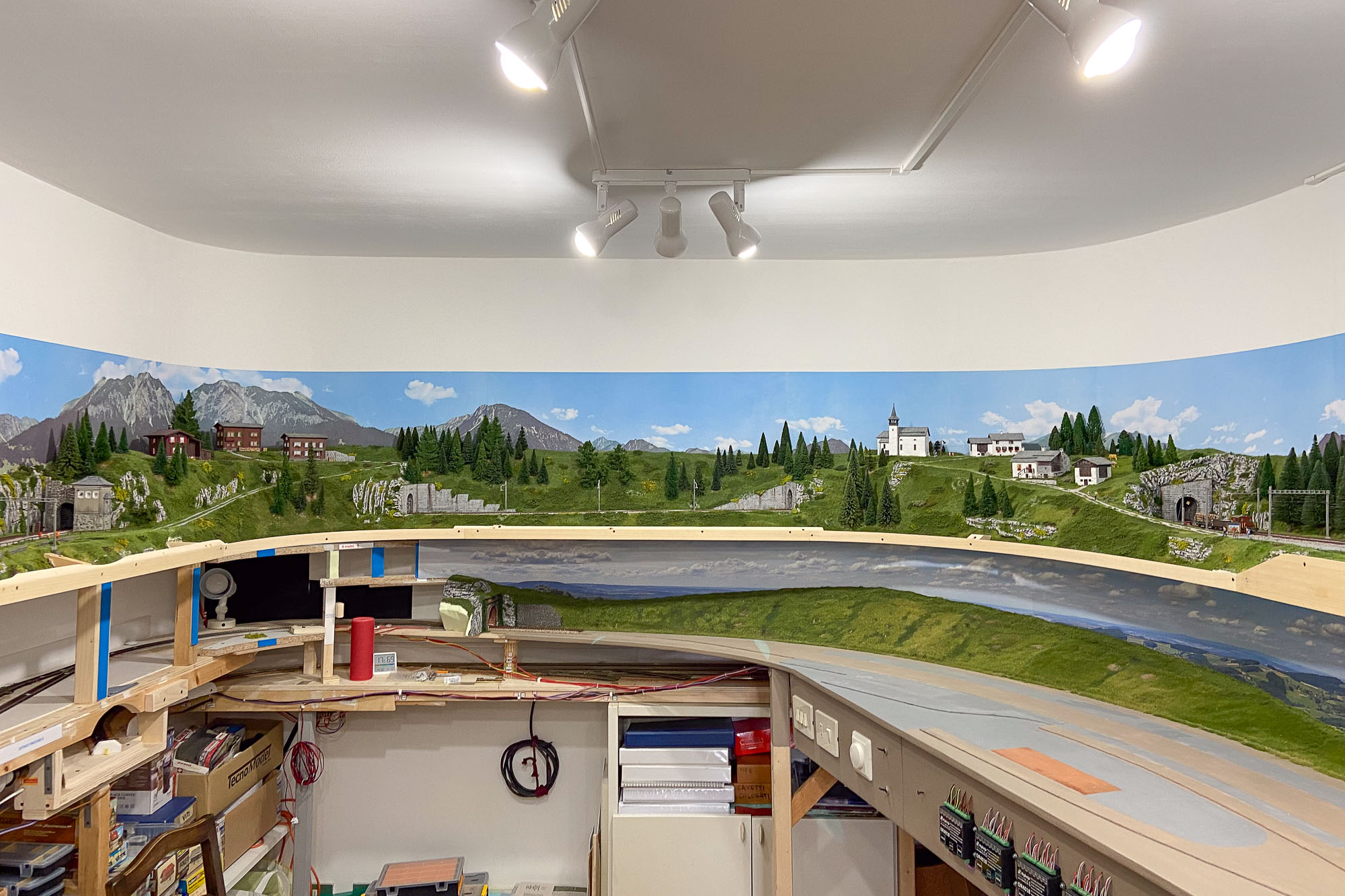 Utilizzando uno sfondo commerciale, per raggiungere gli oltre 17 metri del perimetro della mia stanza ho dovuto impiegare ben 6 elementi e quindi le montagne, i prati, le nuvole… si ripetono 6 volte. Inoltre il punto di congiunzione non è stato ben studiato da Faller producendo delle simmetrie poco realistiche.