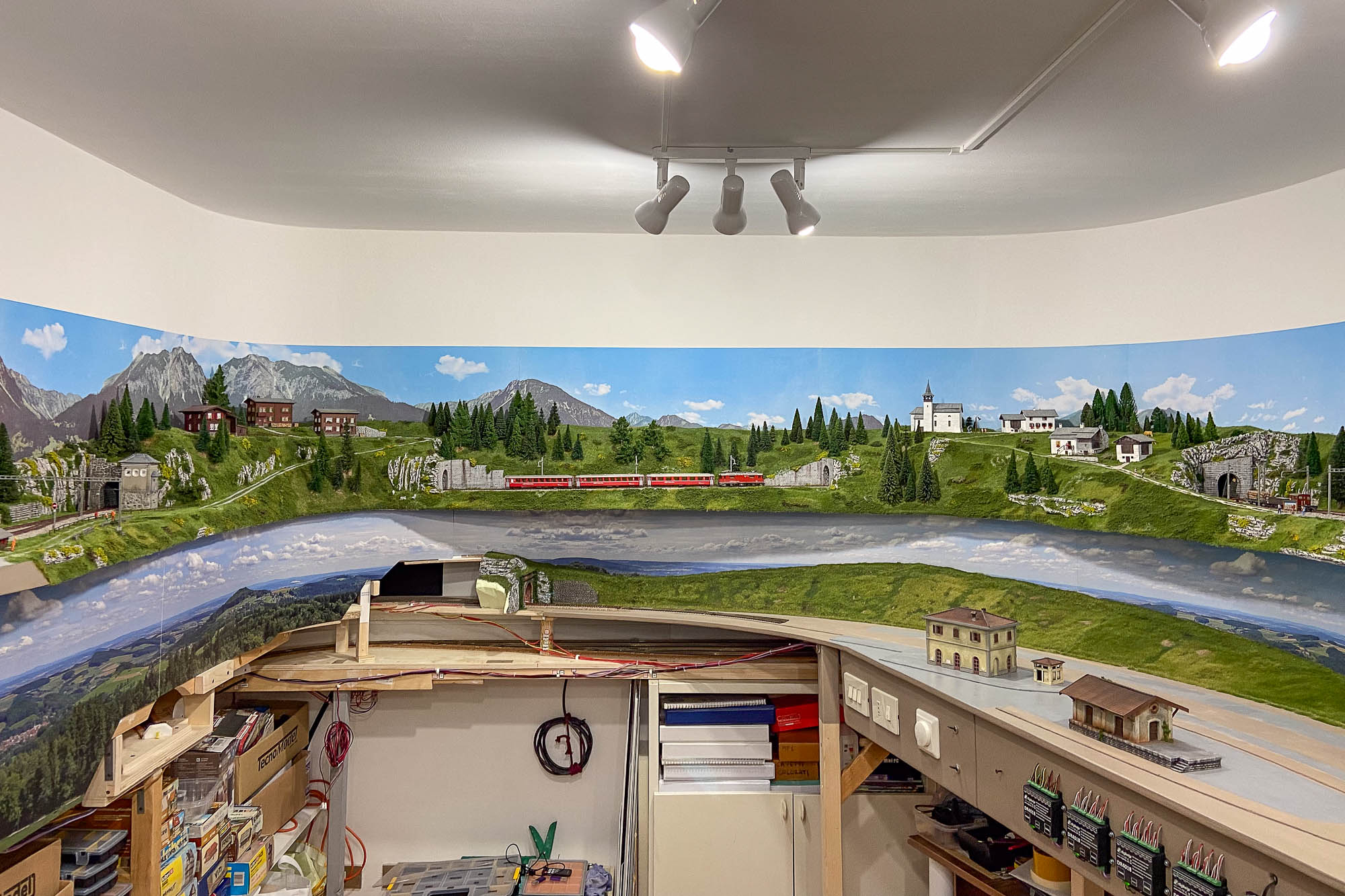 Con un minimo allargamento dell'area hai un netto miglioramento orografico/scenografico dell'impianto RhB, viste le tue capacità non potrà che guadagnarne il realismo, e contemporaneamente hai trovato la soluzione per installare ulteriore impianto luci "sotto pensile" (permettimi il termine) che valorizzeranno decisamente i restanti impianti FS e DB ed elimineranno le antiestetiche ombre create dalle lampade a soffitto.