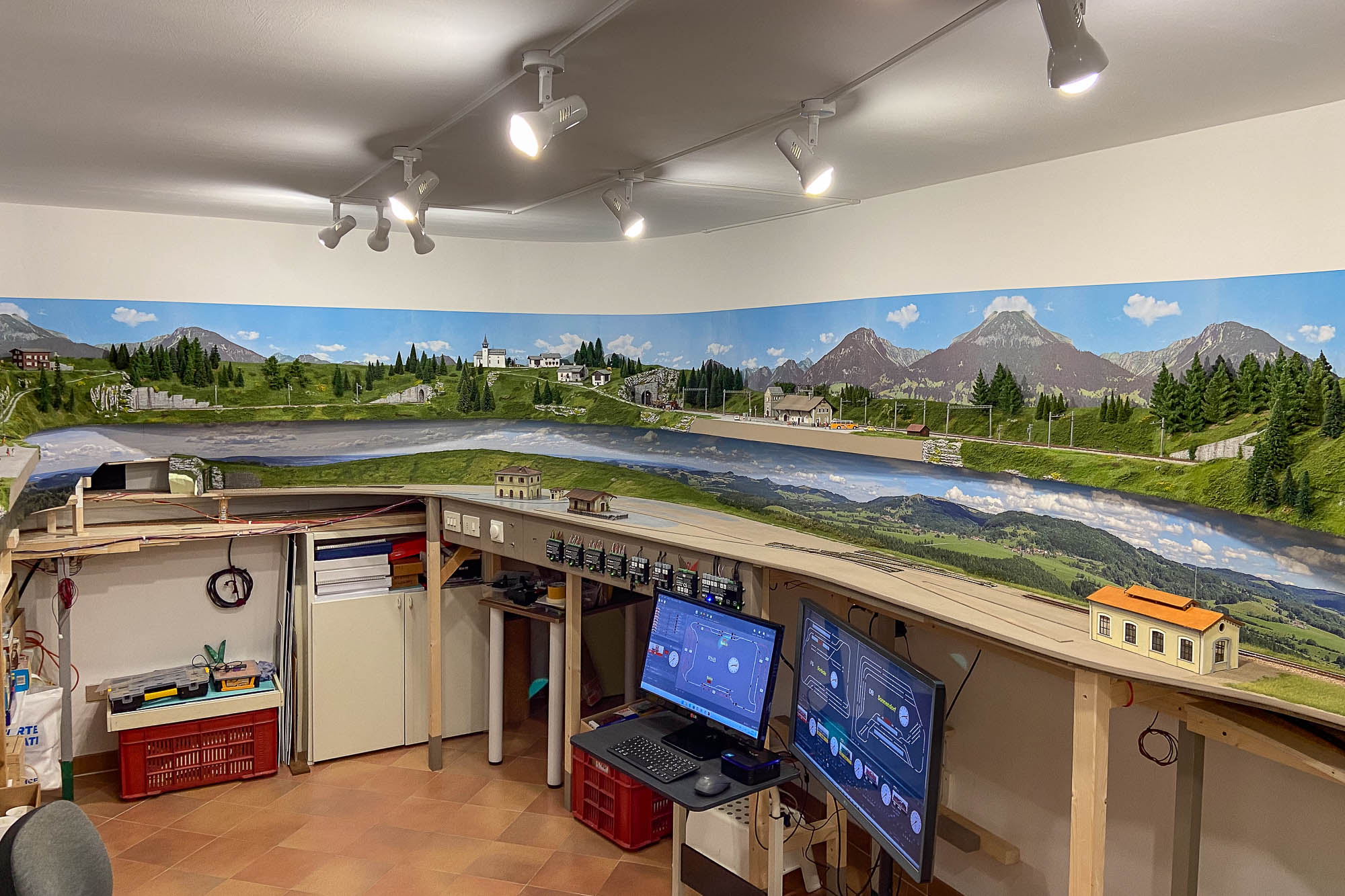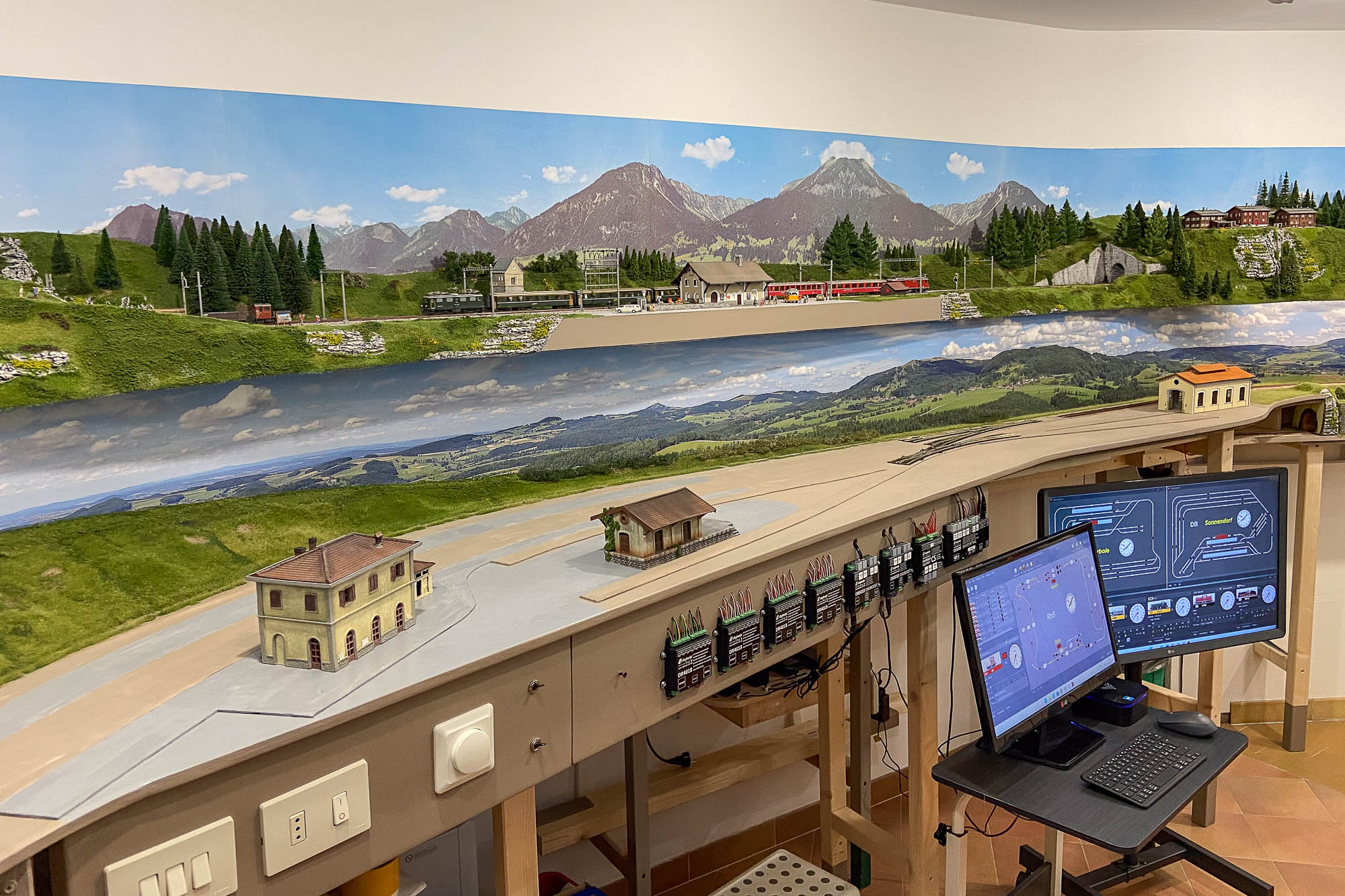 Vi mostro qualche foto. Ovviamente bisogna fare uno sforzo di fantasia dato che manca completamente la parte a vista sul lato sinistro (stazione di “Sonnendorf”). Dovete immaginarvi un piano profondo 70 cm su tutta la lunghezza della stanza…