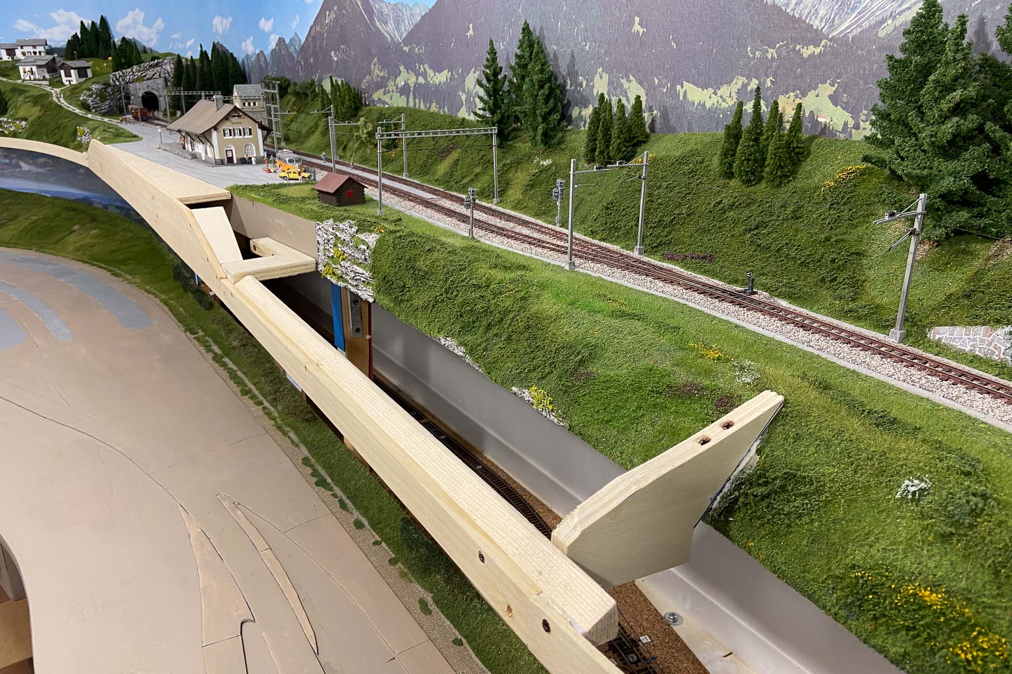 Una volta montato lo sfondo ho ritenuto accettabile la porzione di ombra che in alcuni punti il plastico RhB proietta sulla parte alta dello sfondo stesso.