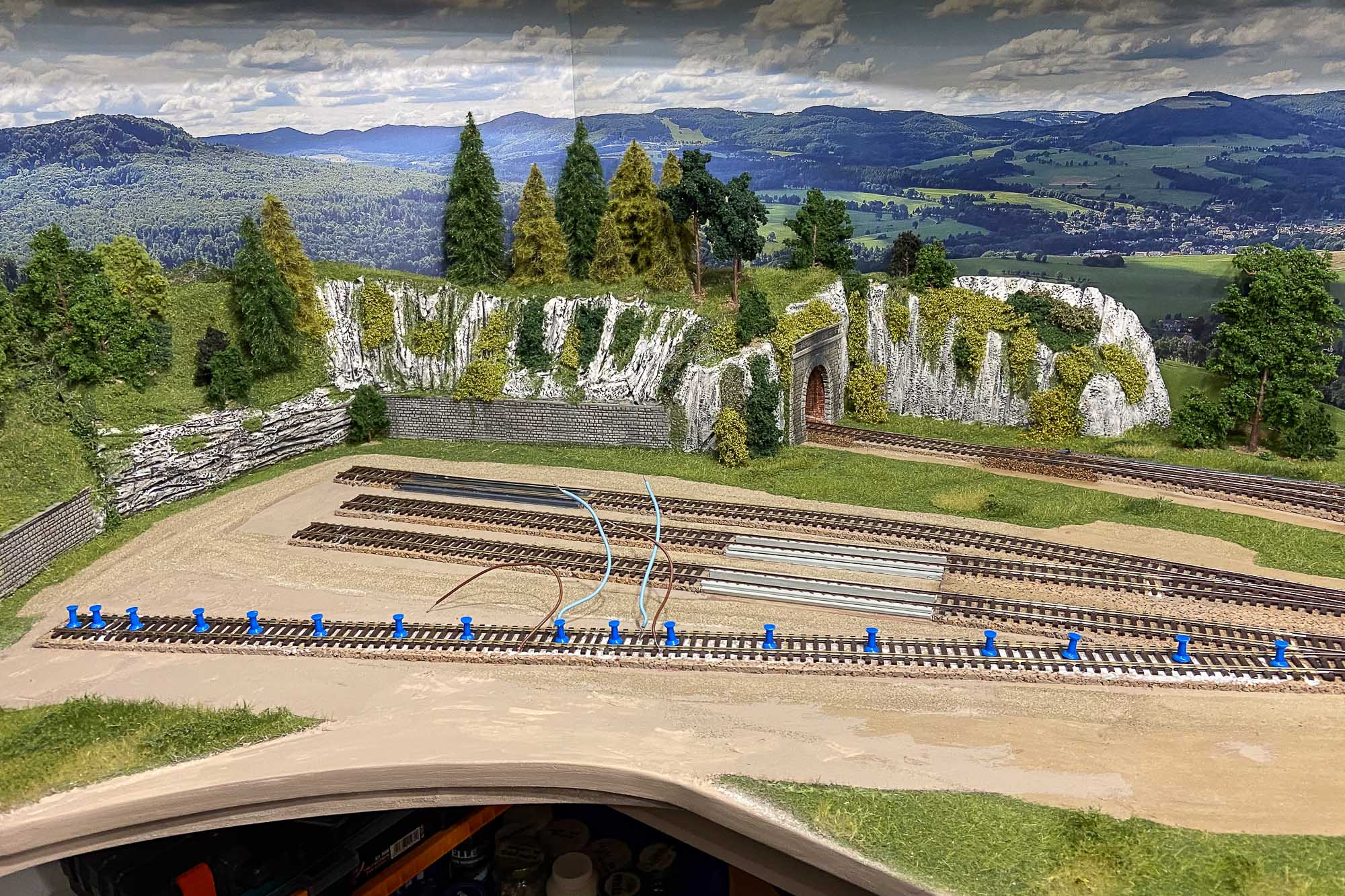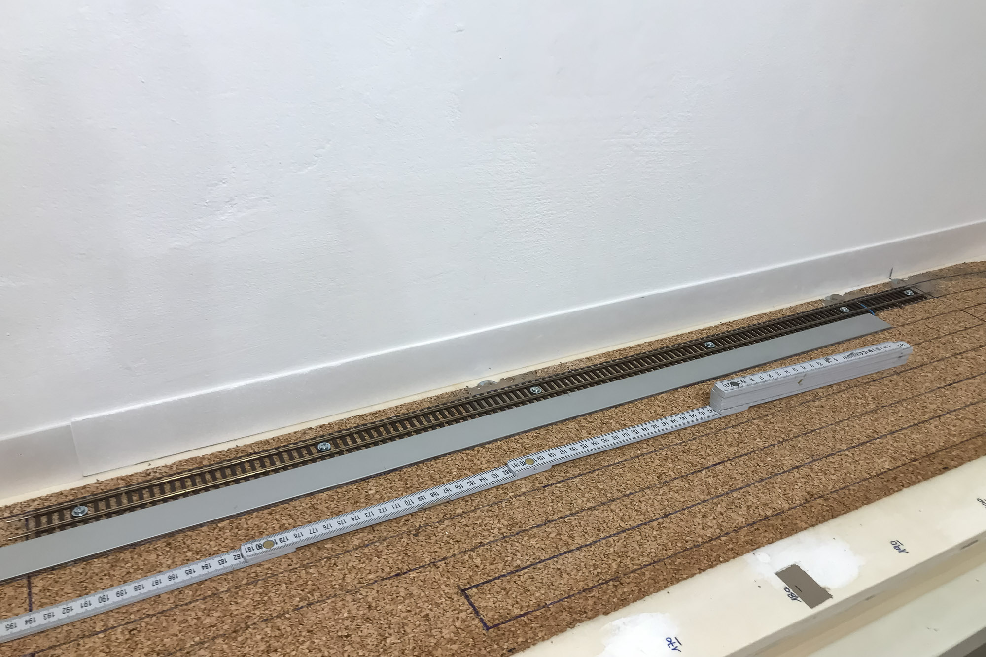 Finora mi ero dovuto arrangiare con pezzi di binario “provvisori” appoggiati sul tavolo da lavoro e collegati alla centrale con cavi “volanti”.