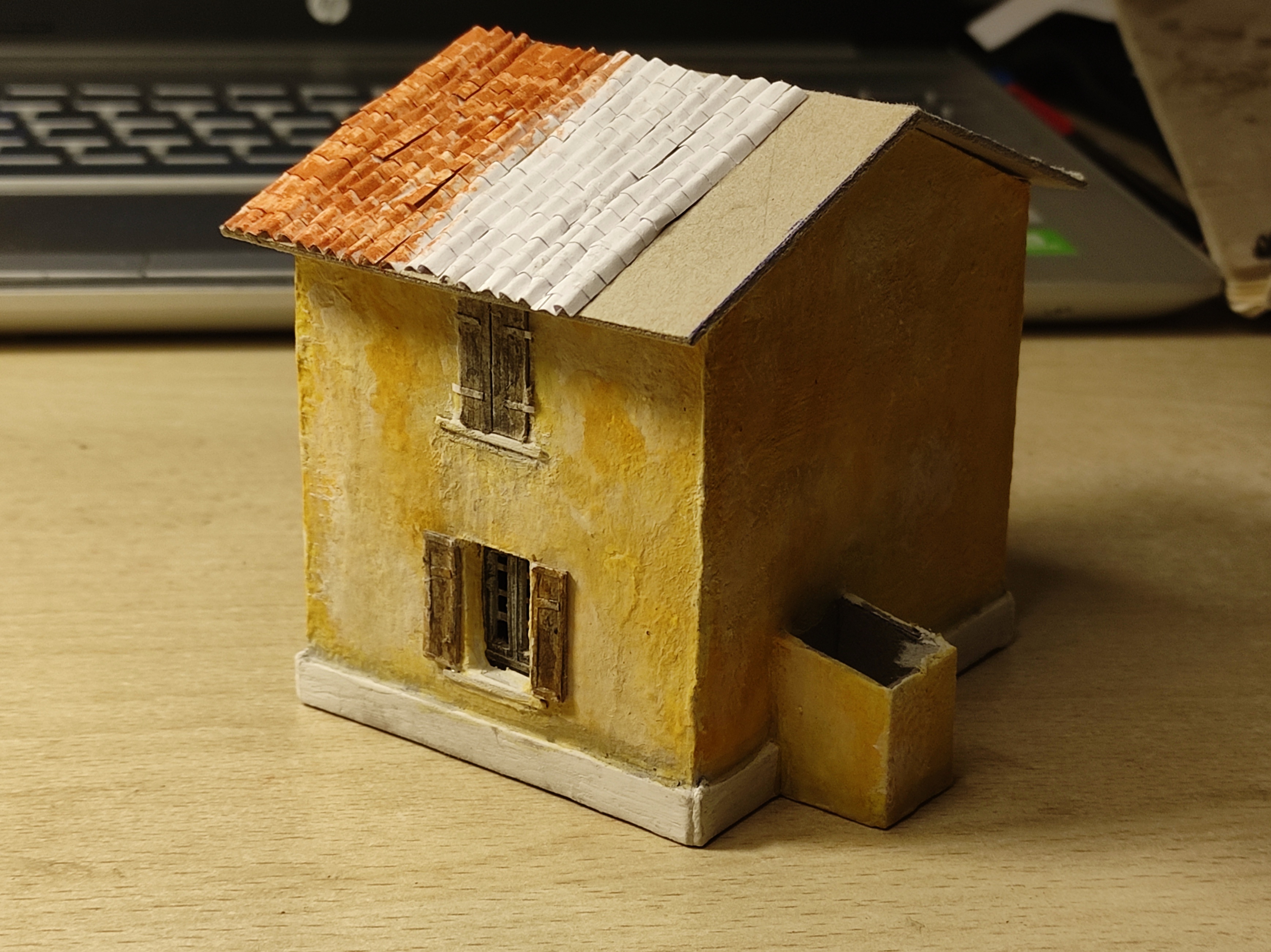 E dunque mini-aggiornamento: qualche ulteriore passaggio di colore sui muri e sul tetto (di cui ho diversificato un po' le tegole con qualche sfumatura); una grondaia montata (da colorare).