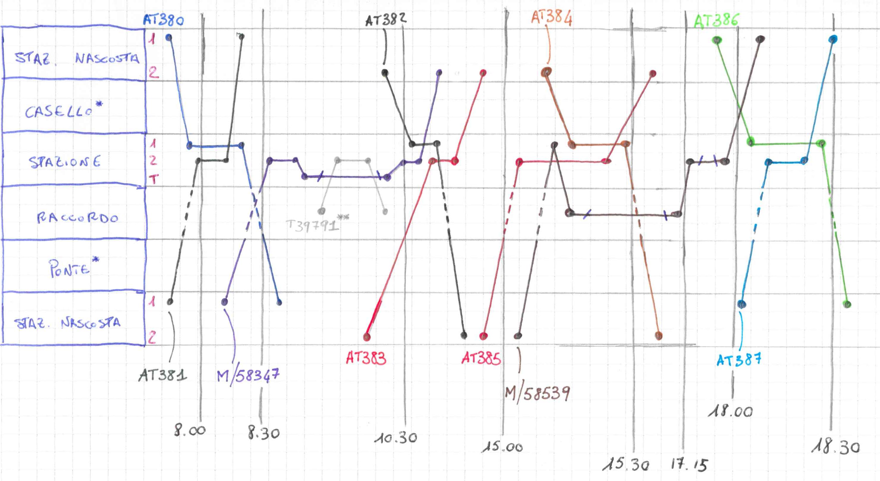 La traccia tratteggiata indica che il treno non è transitato per il raccordo, mentre quando è compresa tra due tratti blu indica che il treno manovra in stazione. So che non è adottato dalle FS, ma è un mio schema di massima per rendere più leggibile il tutto.