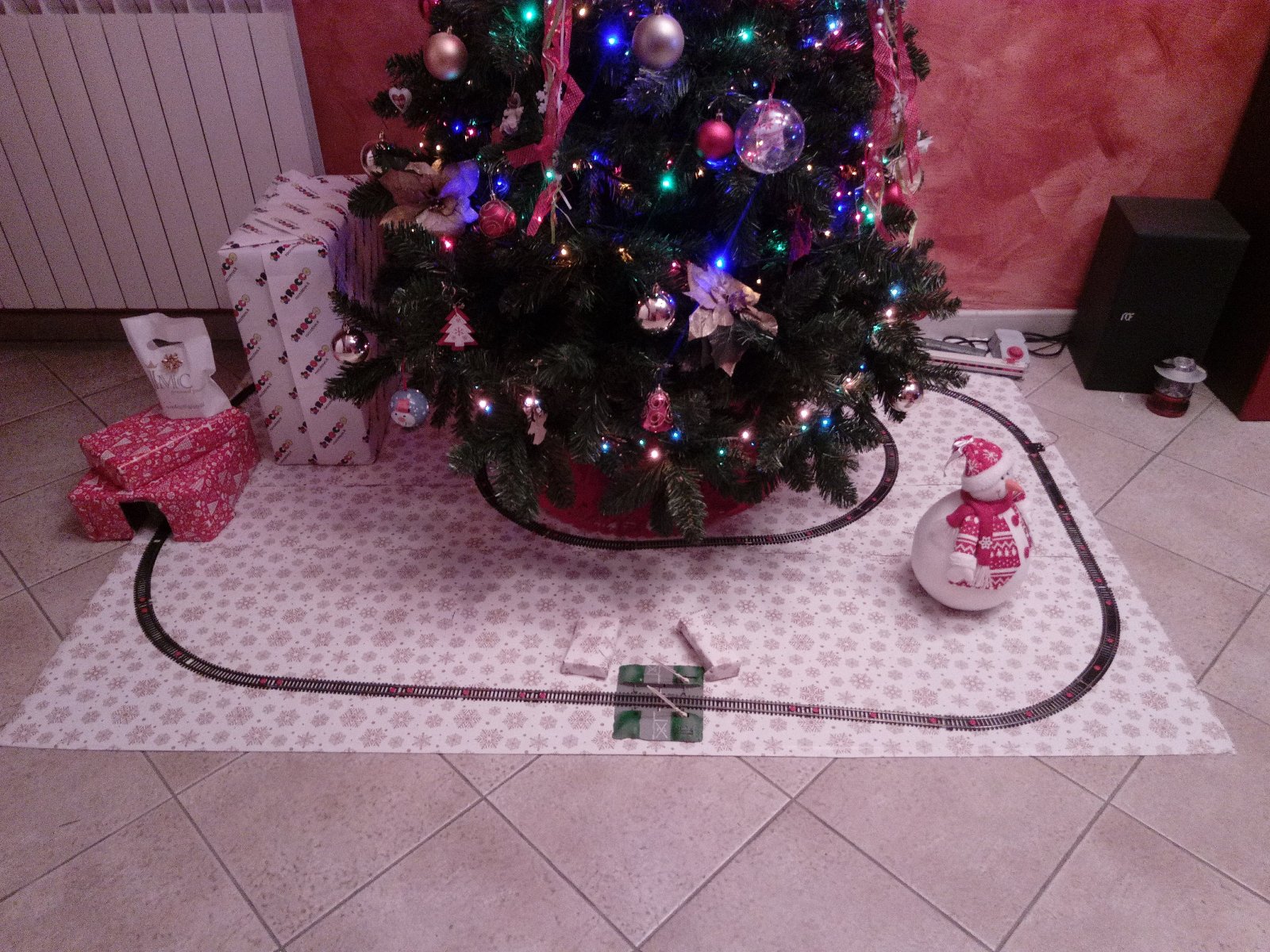 Comunque alla fine ho fatto due loop concentrici (uno grande perimetrale e uno più piccolo che costeggia la base dell'albero, uniti da uno scambio inglese a 36°...ora devo decidere che composizione di carri usare (se passeggeri o merci e modificare il rettilineo frontale mettendo uno scambio dal quale far partire un binario morto di deposito carri per quando la linea rimane ferma...