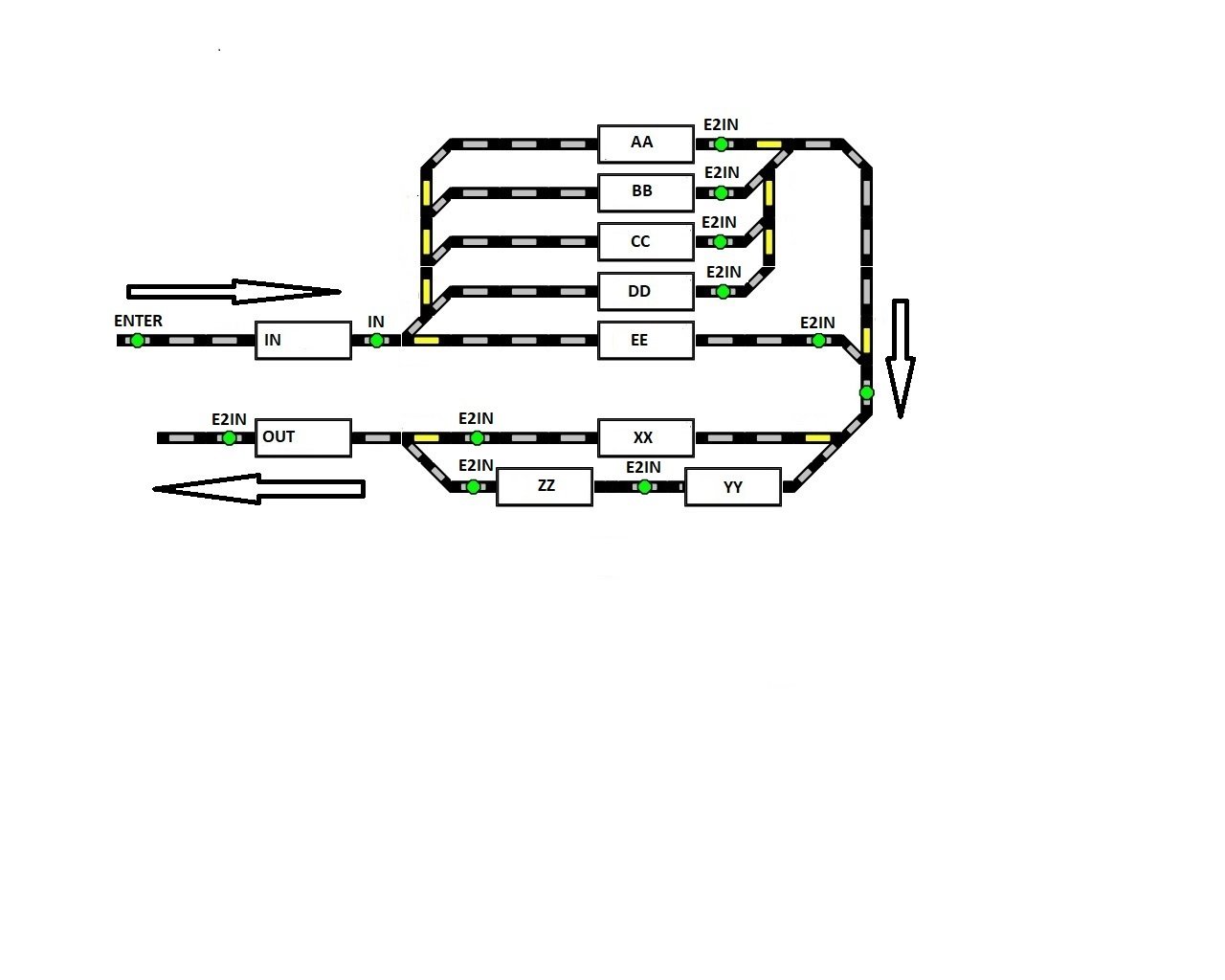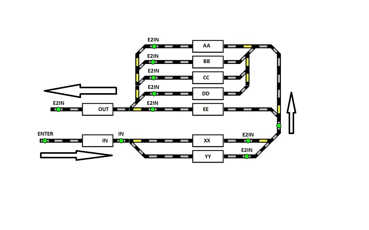 Con la circolazione a sinistra ci dovrebbe essere un blocco (IN) prima del gruppo di deviatoi con i due classici sensori ENTER e IN senza obbligo di sosta. Nel caso ci sia anche un solo blocco successivo libero il convoglio in arrivo rallenterà all'ENTER e sempre rallentato transiterà sull'IN e proseguirà a velocità ridotta fino al sensore ENTER2IN del binario di sosta. Nel caso non ci siano blocchi liberi il convoglio in arrivo rallenterà all'ENTER e si fermerà all'IN finchè non si libererà un blocco successivo. Quando sarà il suo turno, dal binario di sosta (AA-...-EE) il convoglio a velocità ridotta transiterà sul tratto curvo (sensore superfluo senza funzioni ma utile ad avere conferma che il convoglio si sta muovendo) e arriverà ad uno dei binari di partenza (XX-YY). Da questi transiterà a velocità sempre ridotta al blocco OUT e da questo prenderà velocità di crociera verso l'elicoidale.