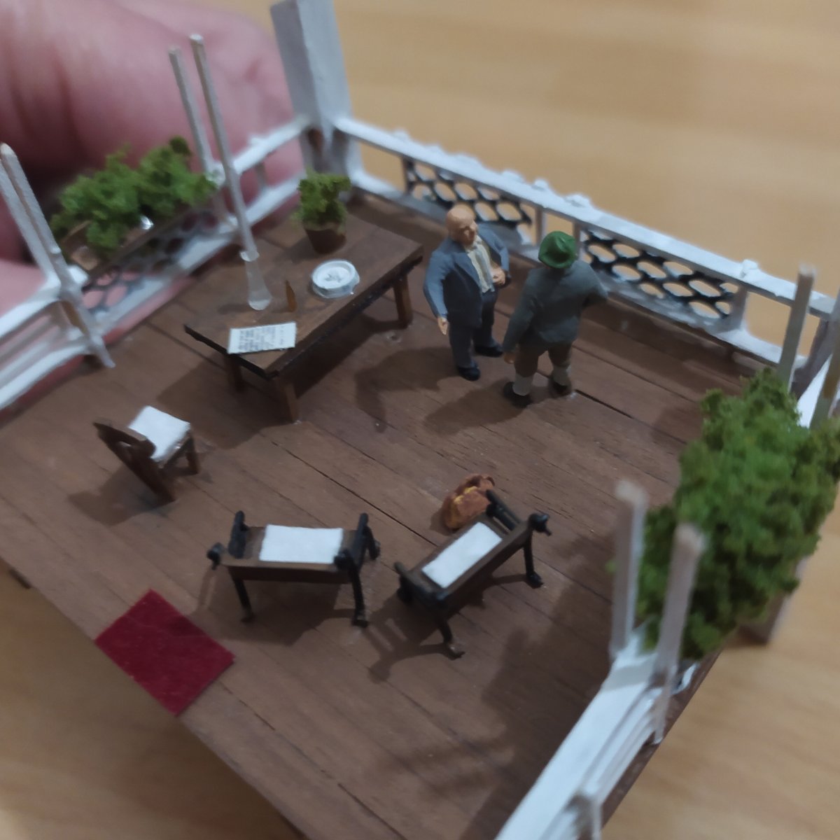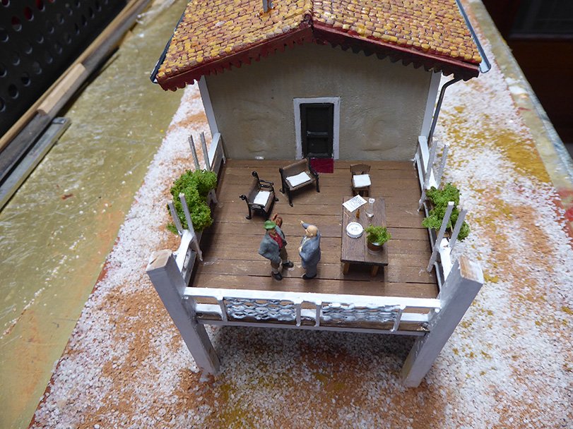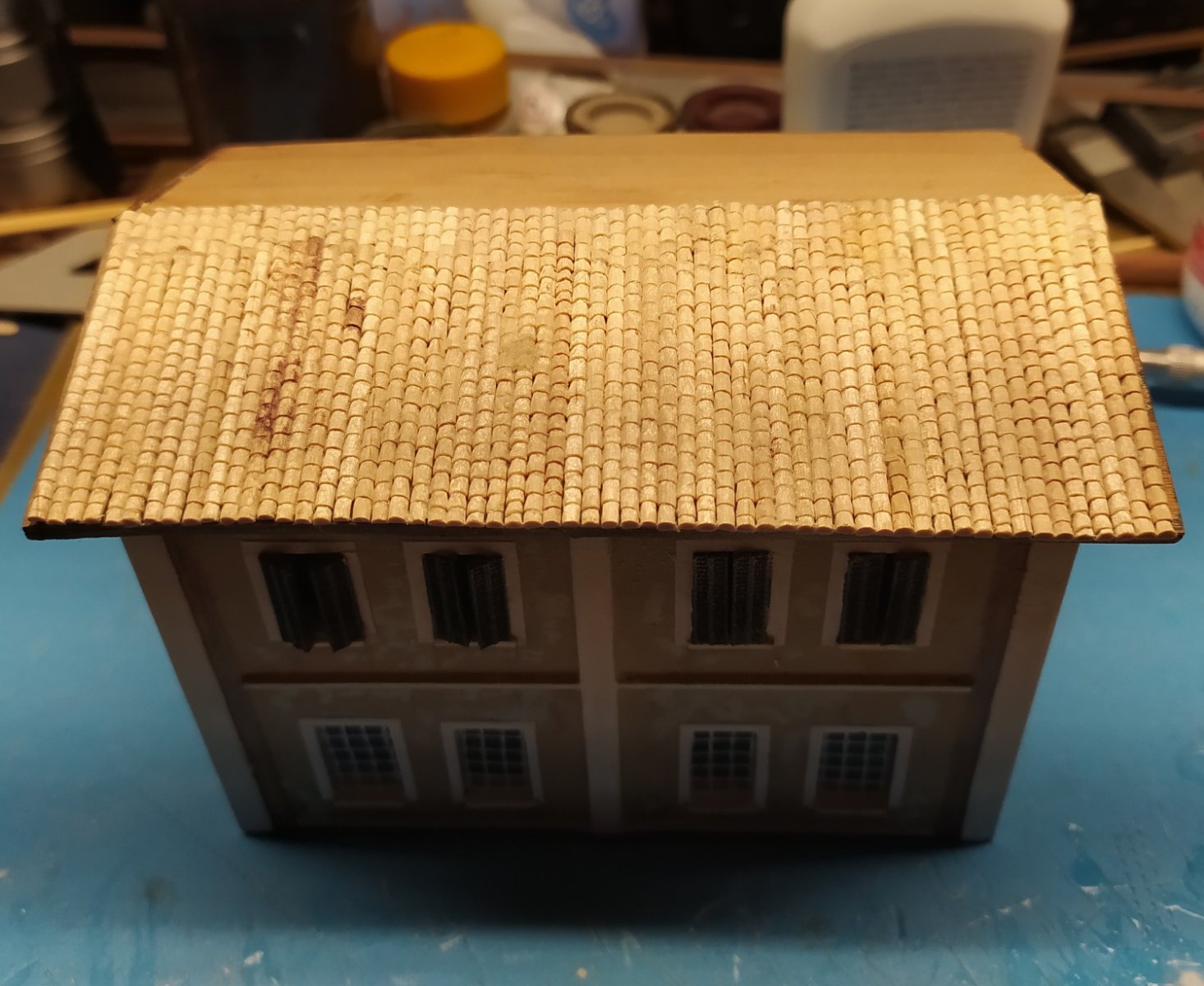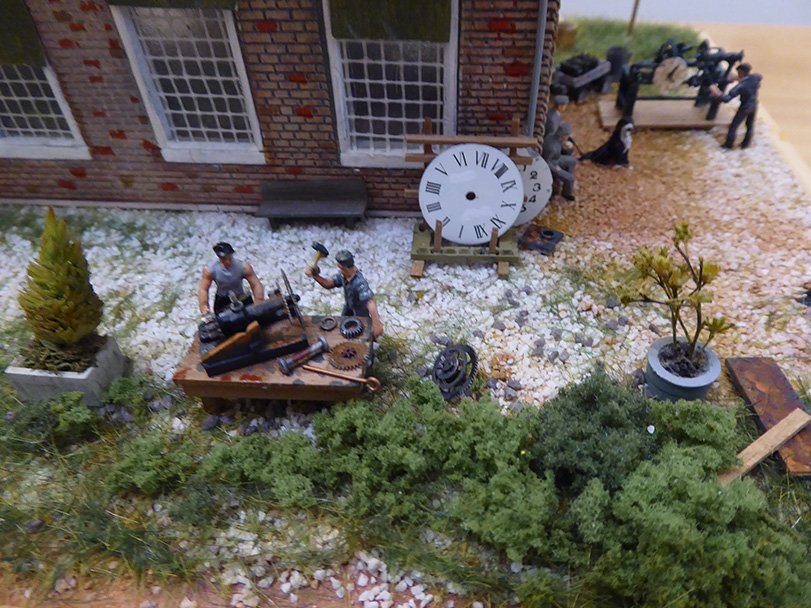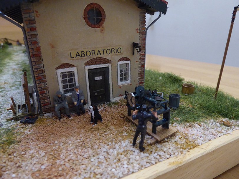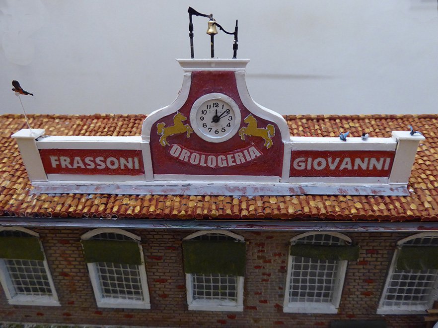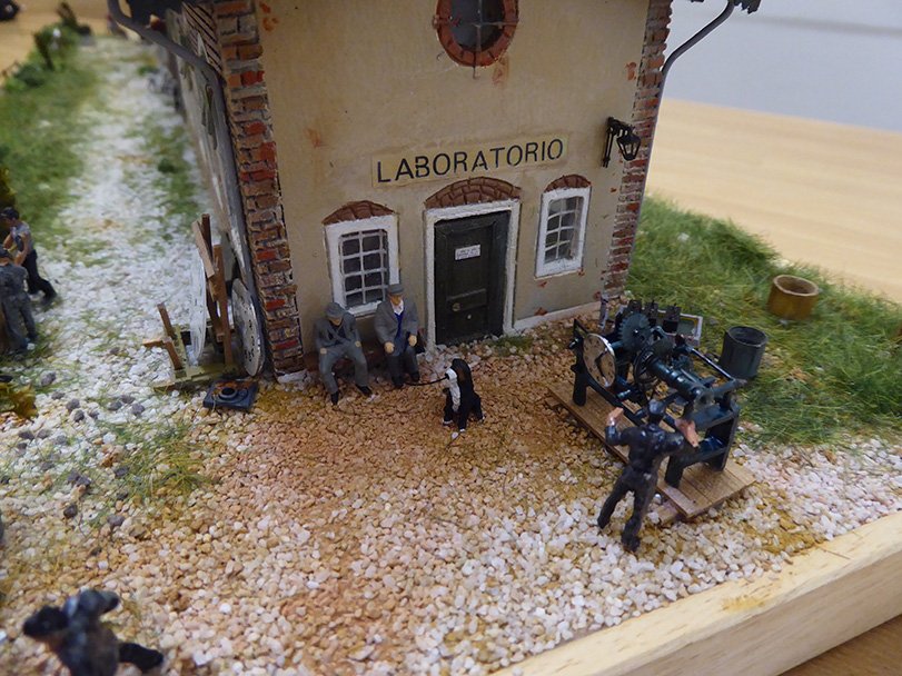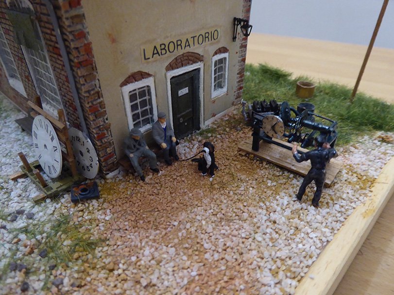 Molto tempo fa , nel forum dove sono iscritto da anni di orologeria , Orologiko , pubblicò un documento riguardante una fabbrica di orologi per torri e campanili, sorta nel 1910 a Rovato, in provincia di Brescia ; il documento conteneva le foto che allego, sufficienti per una riproduzione in scala 1 : 87 di cui mi fu facile trovarne le misure essendone ormai abituato . Il modello che vedete ha richiesto oltre due mesi di lavorazione e qualche grattacapo l'ho avuto in particolare per l'insegna della fabbbrica . Anche questo modello è una combinazione di mie consuetudini tecniche che ormai conoscete, incisione dei tetti con stuzzicadenti ( oltre 450 ) incisione su forex dei muri a mattone vivo, nonchè tutte le travature interne degli edifici , anche se poi non si vedranno, non rinuncio ad ometterle , se si tratta di una cosa storica , tale deve essere come al vero, in fondo non è la parte più laboriosa , piuttosto mi dispiace che non sia visibile la scenetta della terrazza in cui il titolare colloquia con una persona, ma prima di applicare il tetto almeno feci alcune foto ; il diorama misura 61 X 21 cm ; la fabbrica divenne molto più grande cambiando fisionomia negli anni trenta, ormai è scomparsa ; la mia scena è ambientata negli anni 10 ; durante la progettazione , ebbi l'idea di inserire nell'insegna, un orologio ma doveva essere realmente funzionante e che non sporgesse dalla sede di murata ; ci riuscii trovando un orologino da 4.00 € cinese che si adattava perfettamente ed il cui diametro è di solo 1 cm ; funziona perfettamente ed è estremamente preciso, tantochè posso controllare l'ora esatta ! :D Un'altro problemino è stato reperire personaggi adatti per quell'epoca , non esiste nulla infatti, quindi ho adattato quelli che disponevo e che in fondo non presentano particolari caretteristiche temporali , in modo che mi fu facile studiarne le collocazioni con senso compiuto ; io ritengo che quando si crea una scena ci deve essere sempre un punto, un fulcro che va a sottolineare il senso logico di una rappresentazione ed in questo caso lo individuiamo in due punti che pensai improvvisamente , ossia , i due quadranti grandi da torre di orologio ed il macchinario di grande orologio posto esternamente l'ingresso del laboratorio, in cui un operaio lo controlla ; è estrememente piccolo, difficile e mi ha impegnato per bene la vista ! Notiamo che ha un piccolo quadrante che serviva come riferimento ora , mi ero documentato infatti, erano orologi molto grandi e pesanti . Va notato anche l'altezza delle finestre della fabbrica, erano basse, altezza uomo, poichè internamente e giusto al di sotto, c'erano i banchi di lavoro, per ottenere una migliore illuminazione, inoltre avevo notato nell'unica foto, che esistevano anche le tende , particolare che non dimenticai . Sotto la terrazza , troviamo la donnina che va a trovare Teo , il cane presso la sua casetta rifugio, idea nata all'improvviso. Due operai intanto , sono alle prese di demolizione con un macchinario di fabbrica su di un tavolo . Non manca come al solito un merlo che svolazza sopra i tetti mentre tre minuscoli uccellini sono posati sopra l'insegna ; la campana è in ottone che ho tornito, al vero era piccola ed a doppio battente, sicuramente creava un'atmosfera di rintocchi particolare . Le scritte dell'insegna mi procurarono numerosi grattacapi poichè la mia stampante non riusciva più di tanto a definirne i contorni e tonalità, una seria situazione che ho temuto molto e che per fortuna sono riuscito a risolvere . Il prato è discreto, distribuito con lo spargierba elettrico, ma non avevo spazi sufficienti per manovrarlo correttamente, comunque mi accontento, non è male . Avrei voluto iserire un carro a ruote in legno della Preiser, purtroppo costa molto ed ho rinunciato . Vi lascio alle foto , però è una dimostrazione che due interessi diversi, tra orologeria e modellismo, possono trovare collegamento tra essi, il modellismo porta strade infinite e permette tantissime forme di conoscenza e cultura .
