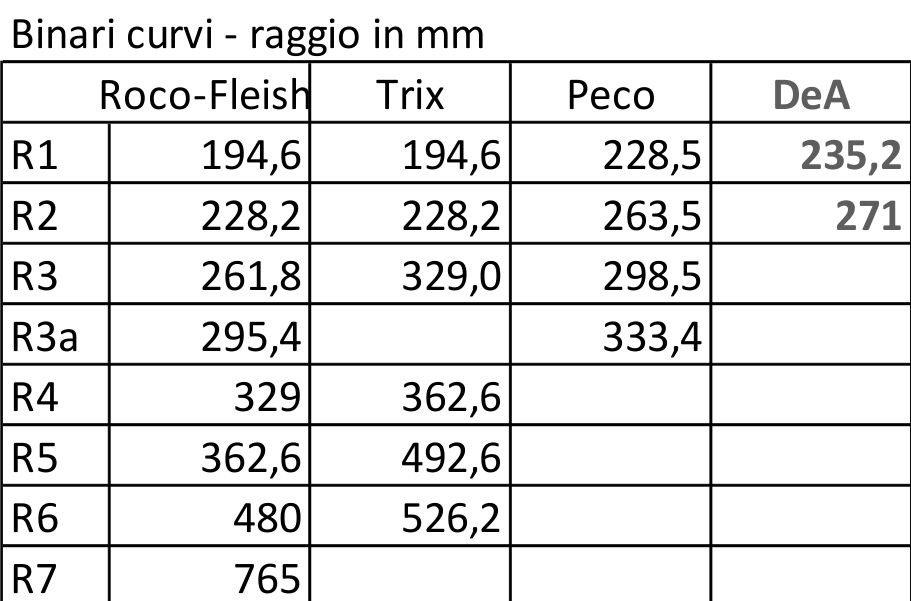 La vedo difficile adattare binari di altre marche al plastico DeA. Non tanto per i binari dritti ma per quelli curvi. Anche io sto (stavo) pensando di acquistare binari di altri marchi per anticipare i tempi della DeA, e ho fatto un po' di ricerche; mi sono reso conto che ci sono grosse differenze fra le varie marche. La tabellina allegata riporta i raggi di curvatura dei binari Roco-Fleishmann, Minitrix, Peco e DeA. Quelli che più si avvicinano ai DeA sono i Peco ma onestamente non so quanto peserebbero le varianti da apportare al tracciato. Gli altri sono improponibili a meno di non stravolgere tutta la posa delle plance.Mattia85 ha scritto:con massicciata....o consigliate senza? mi hanno regalato un set digitale ed ha i binari con massicciata e pensavo di usare quelli per tutto il tracciato.