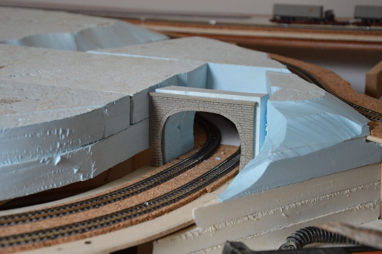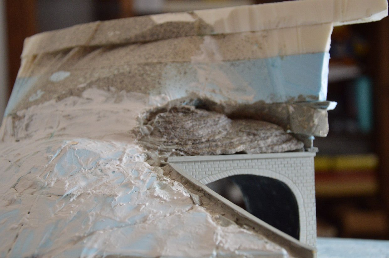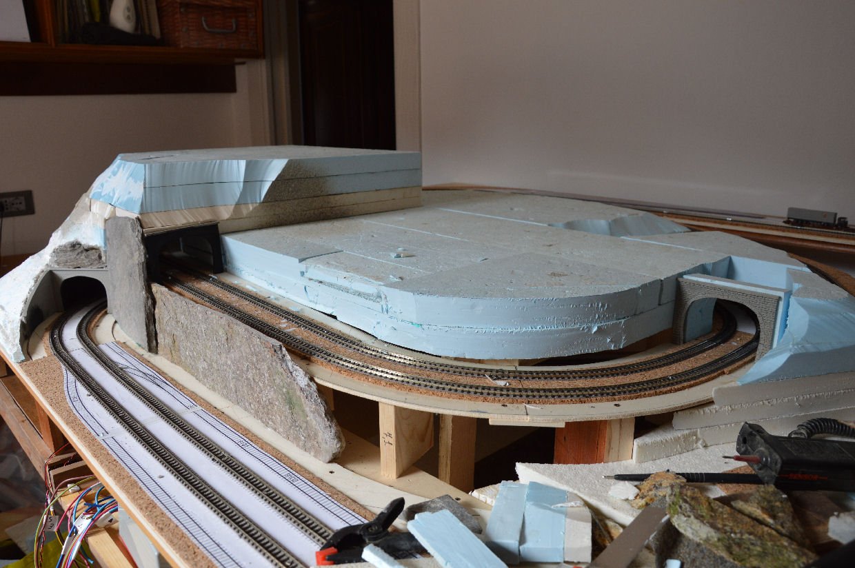 I fogli che hai usato sono poliuretano espanso, lo usati anch'io, sono ottimi anche perché si lavorano e non fanno i pallini come il classico polistirolo, o visto che hai come me realizzato anche l'interno delle gallerie, io ho preferito prima di colorare stuccare con lo stucco a pasta fine la volta, mi sono trovato meglio in fase di colorazione