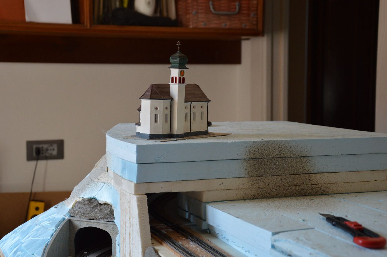 sono fogli con spessore da 3 cm quelli blu uno da 5 cm Bianco un pezzo da 10 cm giallino ed una serie di fogli 60X120 da 2 cm bianco puntinato, sono tutti molto robusti e facili comunque da tagliare sia con il cutter che con il filo caldo. ho provato a presentare la chiesetta sul cucuzzolo. mentre costruivo questa parte mi è venuta voglia di utilizzare della pietra vera per fare il muraglione così ho rismontato la parte già costruita ed inserito le due lose tagliate e sagomate per farle stare in piedi e fissate con colla a caldo ho scoperto che il polistirolo regge anche la colla a caldo, per cui ho fissato anche la pietra sopra il portale. quello che sto trovando difficile è far aderire la vernice sulla plastica gialla utilizzata per fare i portali, soprattutto farla penetrare nelle incisioni.