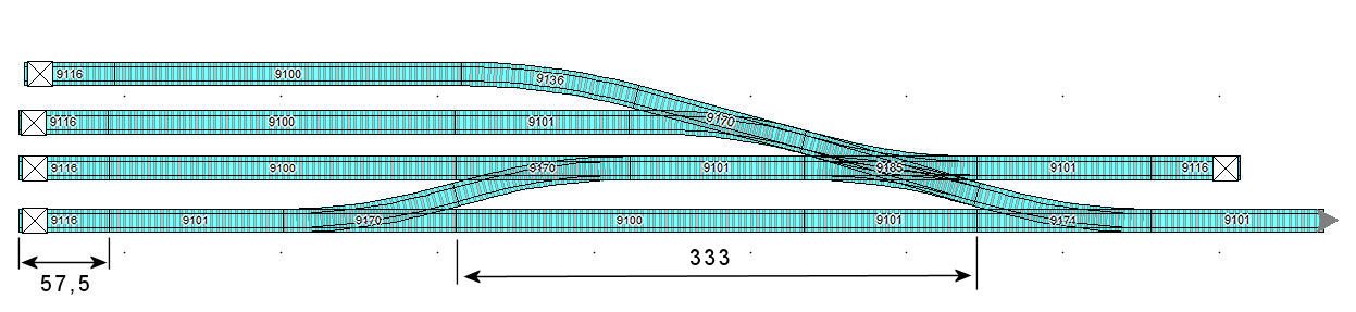 Non vorrei suggerirti una baggianata ma potresti leggermente curvare il quarto binario (in rettilineo) dopo lo scambio ed innestare lo scambio con quello opposto in maniera che se devi compensare poi inserire un piccolo pezzo di binario. Credo che sia fattibile. Saluti. Egidio. [51]