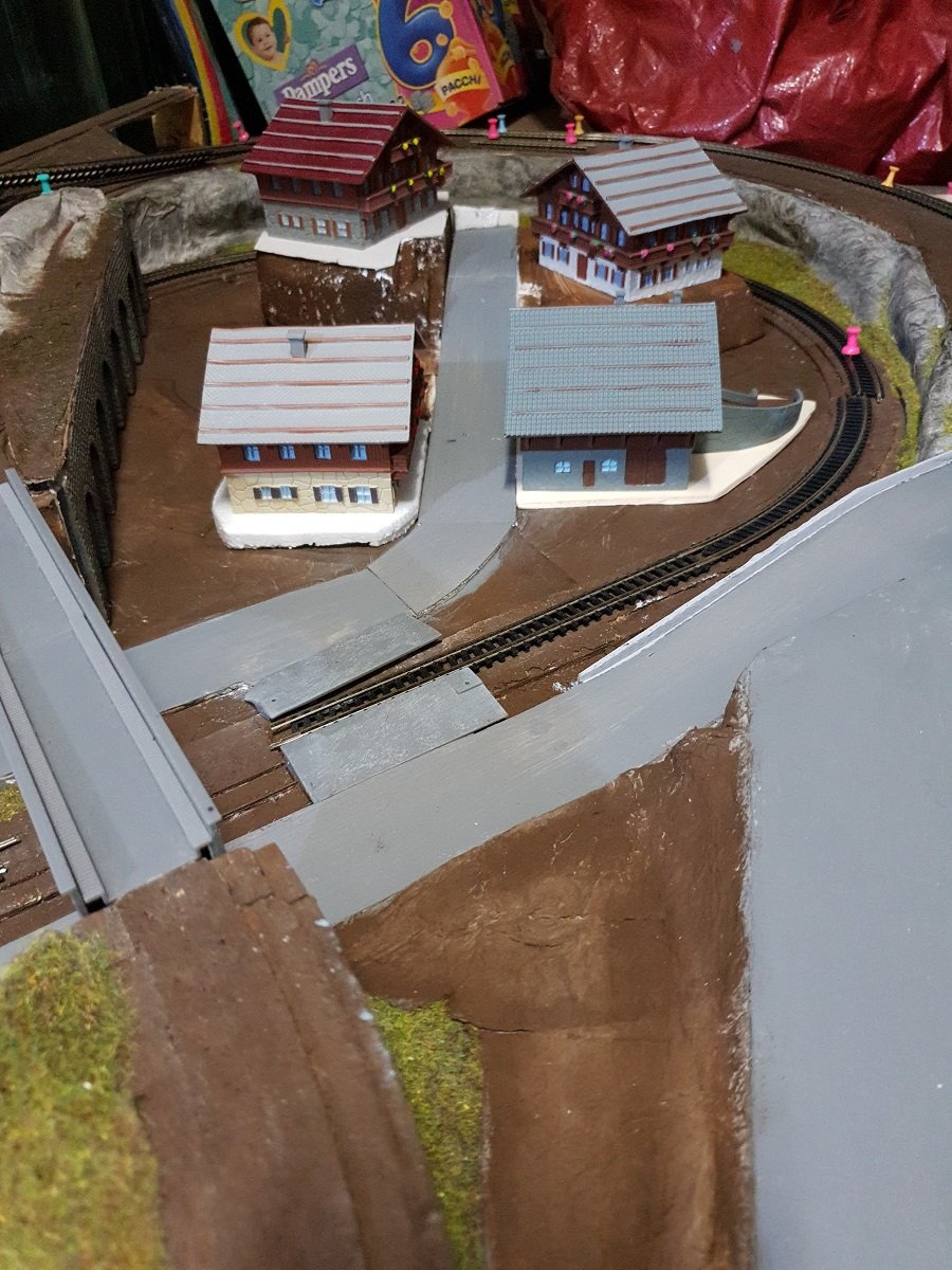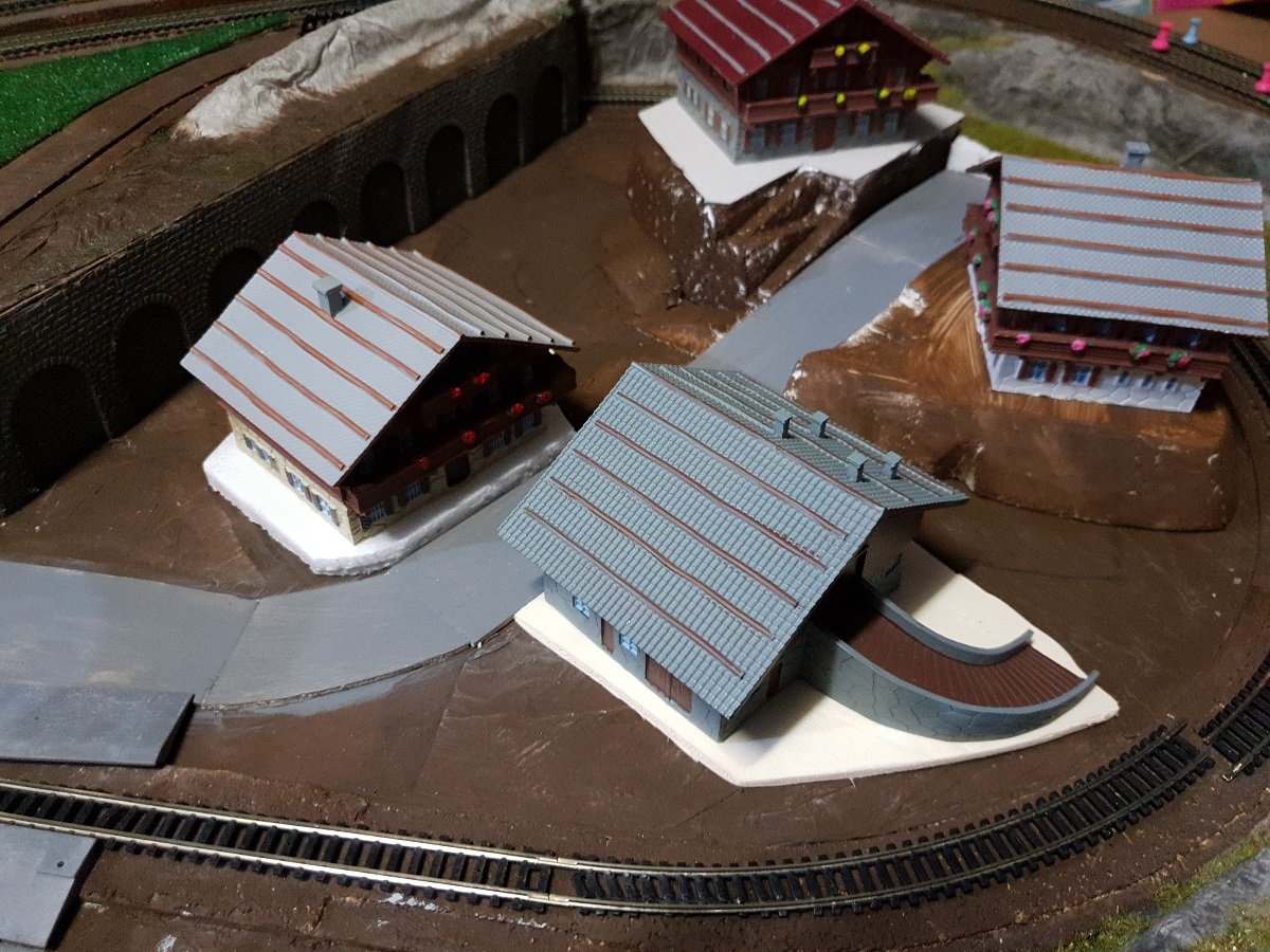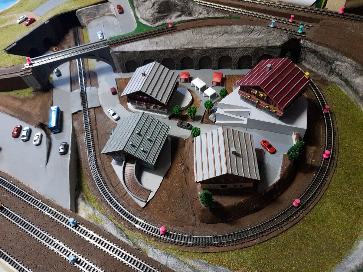 Infine, ho cominciato il posizionamento degli chalet sulla parte destra su vari livelli e spostato (per la terza volta :shock: ) il PL e la strada che porta alla stazione.