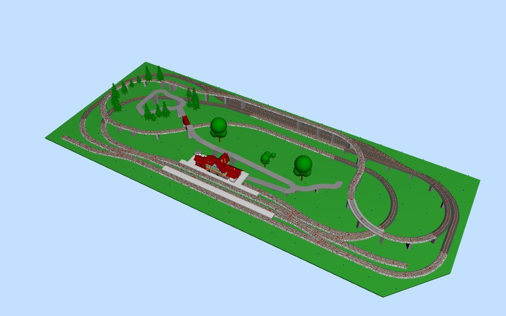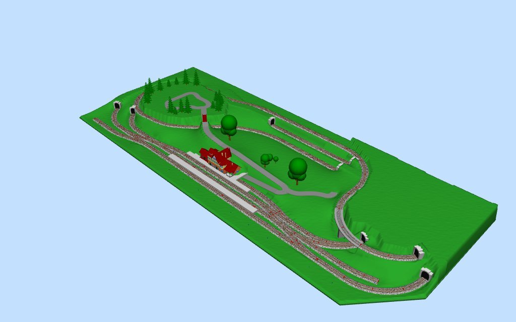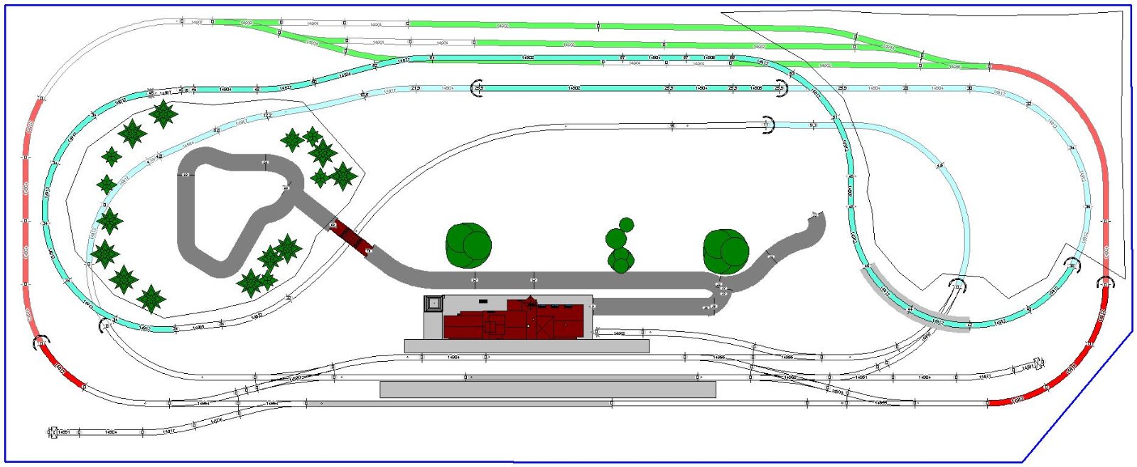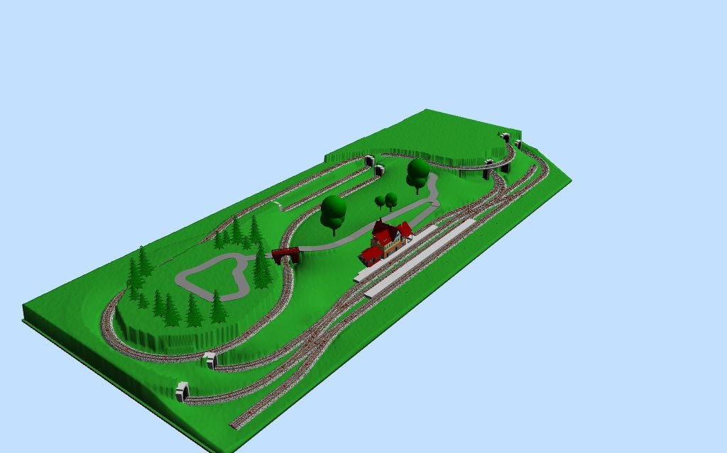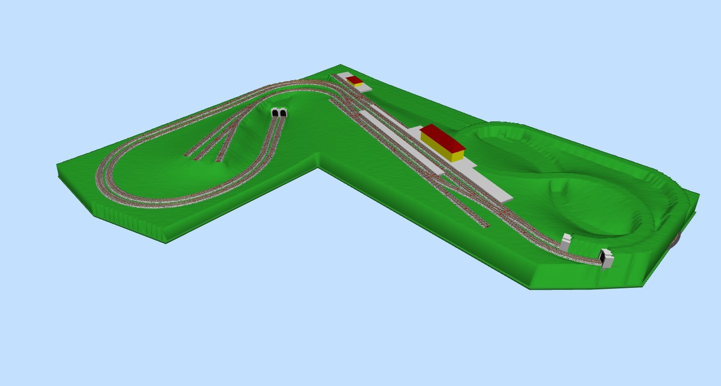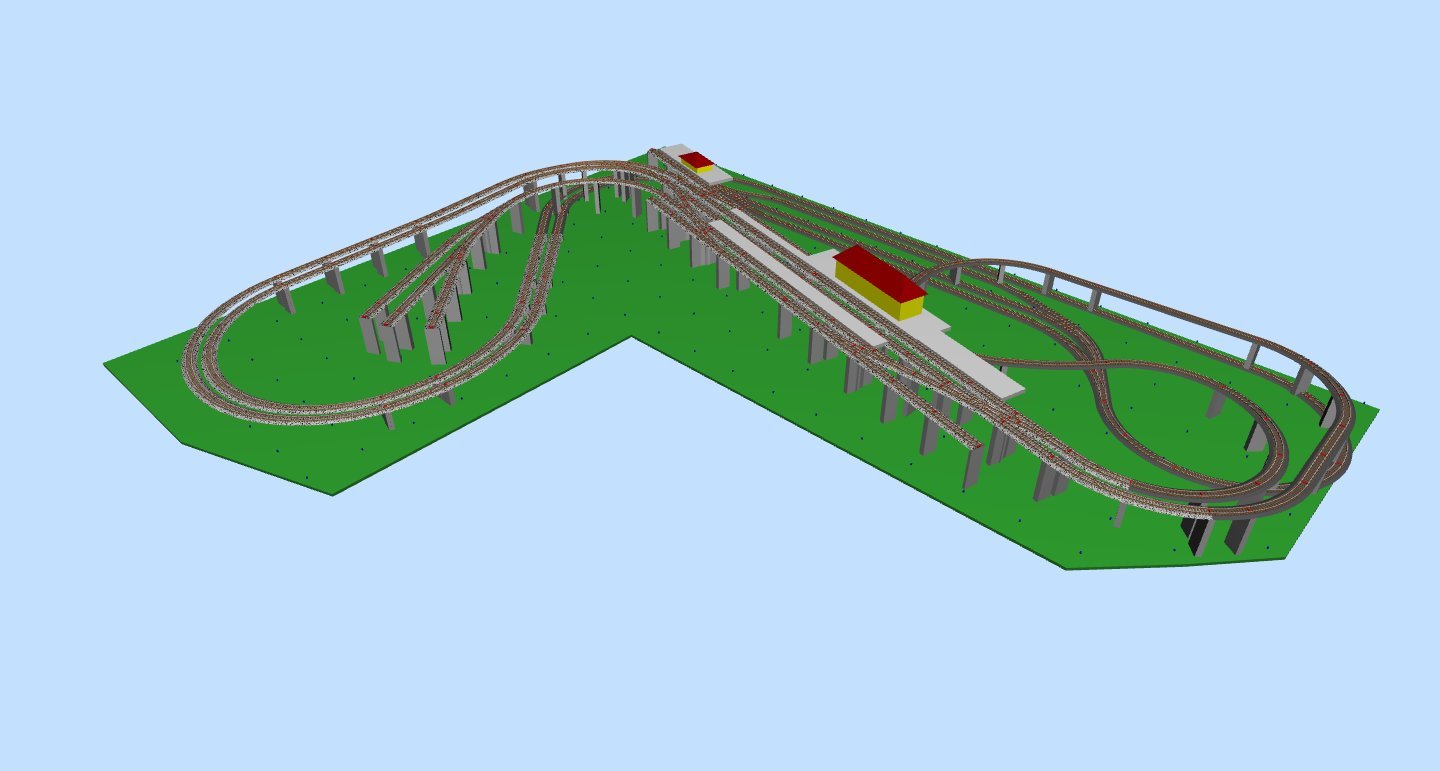 Dovendo inserire i cappi ho riprogettato la stazione ombra e preferito mettere il magazzino merci nell'angolo a sinistra, anche perché il cappio sopra è stato tosto, cove vedi ho dovuto metterlo a mezza altezza perché altrimenti non ci stava, la curva interna ha una pendenza del 3,5% però è utilizzata sempre in discesa, la salita invece ha una pendenza ottima, poco più del 2%.