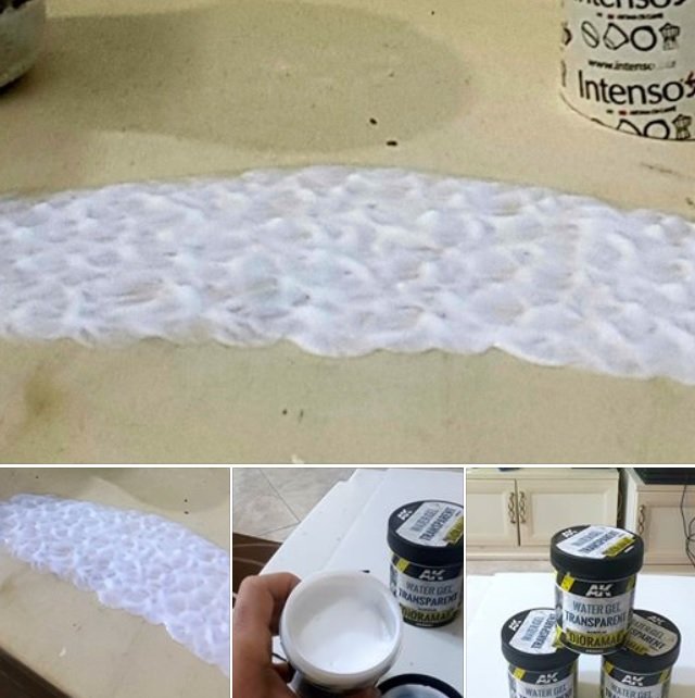 Prime impressioni su AK water gel 8002.Allora il prodotto è sicuramente valido.Va mescolato accuratamente prima dell'uso.Teme l'umidità, quindi tenetelo presente quando lo applicate.L' unico problema non del prodotto ma di chi l'utilizza è saper ricreare a arte le onde del mare.Ho provato soffiando con aerografo, con spatolina, con pennellino...L' unica textura e tecnica che mi soddisfa in scala N é il tampone/timbrino.
