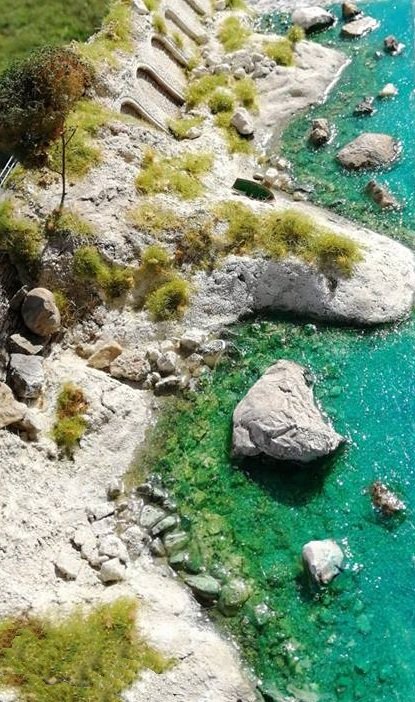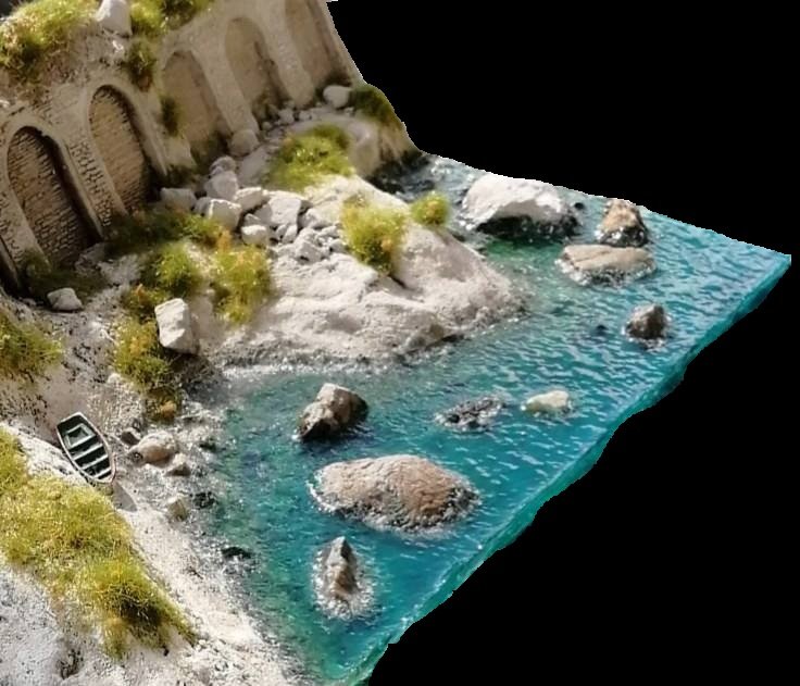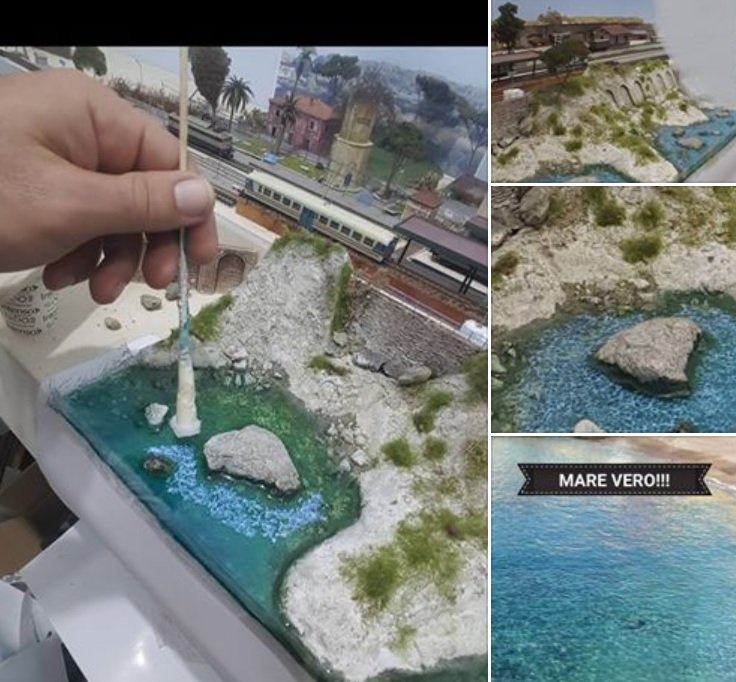 Grazie ragazzi.Ancora sto sperimentando.Sono in attesa che mi arrivino questi 2 prodotti.Resina epossidica trasparente per riempire le zone dove ci sarà il mare e un gel trasparente per ricreare il moto ondoso.Ho preso pure dei coloranti per resine.Blu e verde per fare altri esperimenti per ottenere un mare un pò meno cristallino e trasparente.