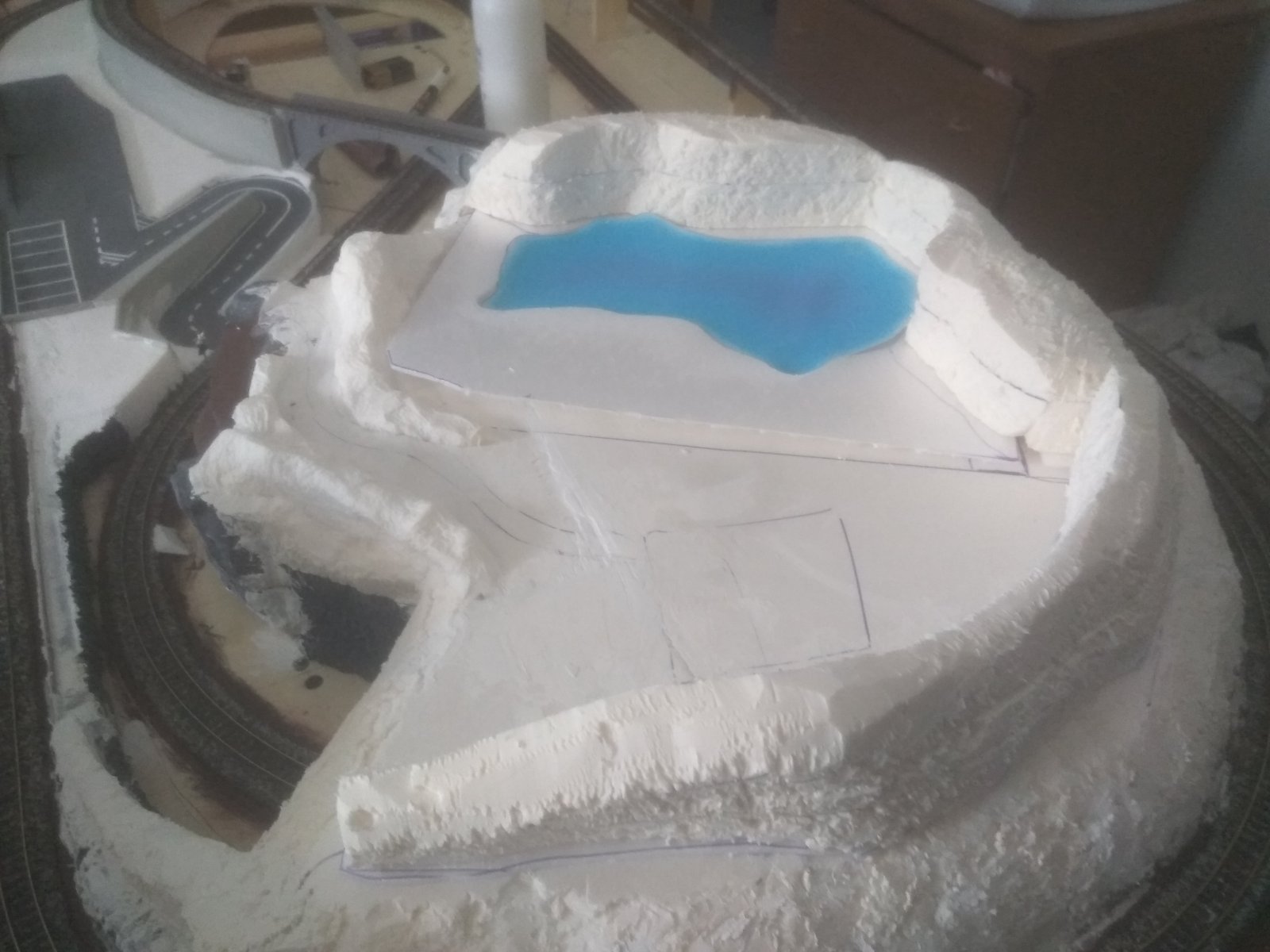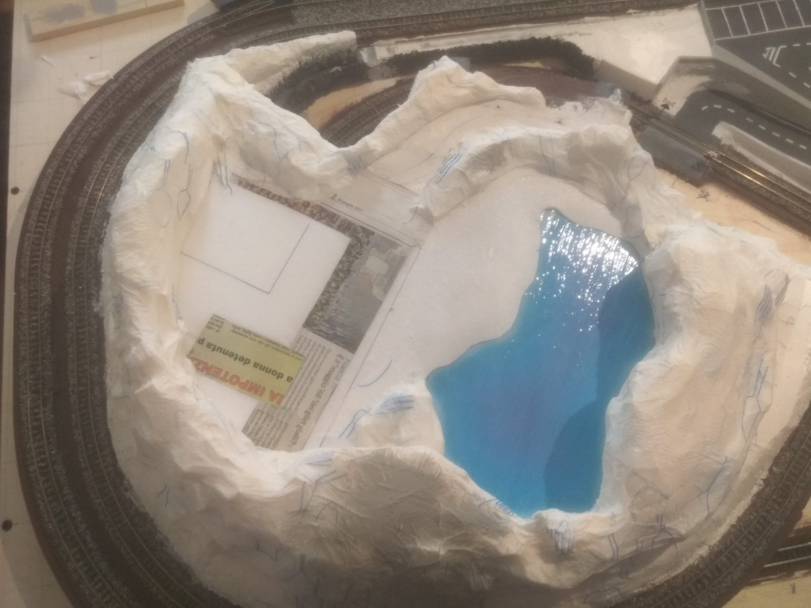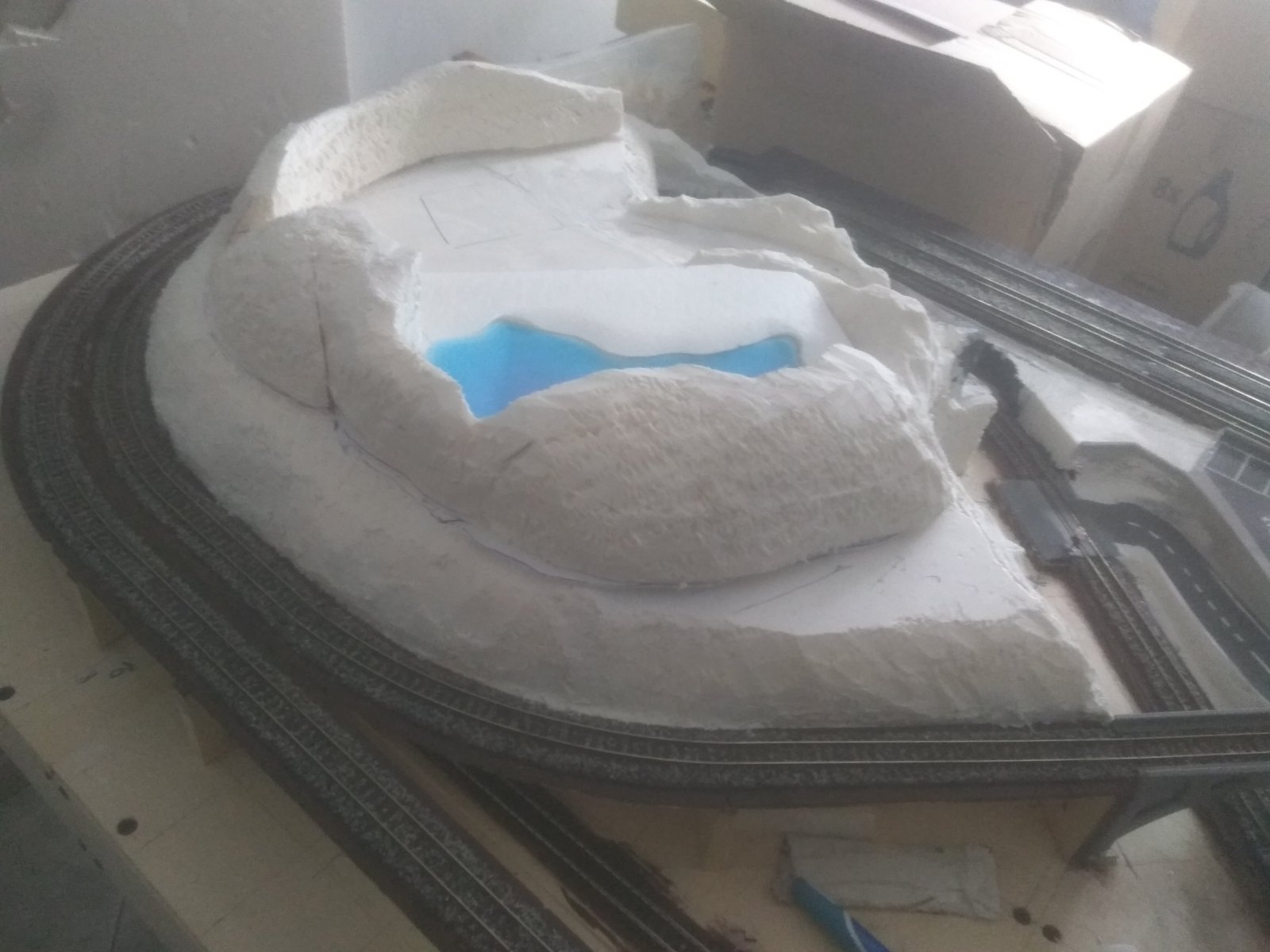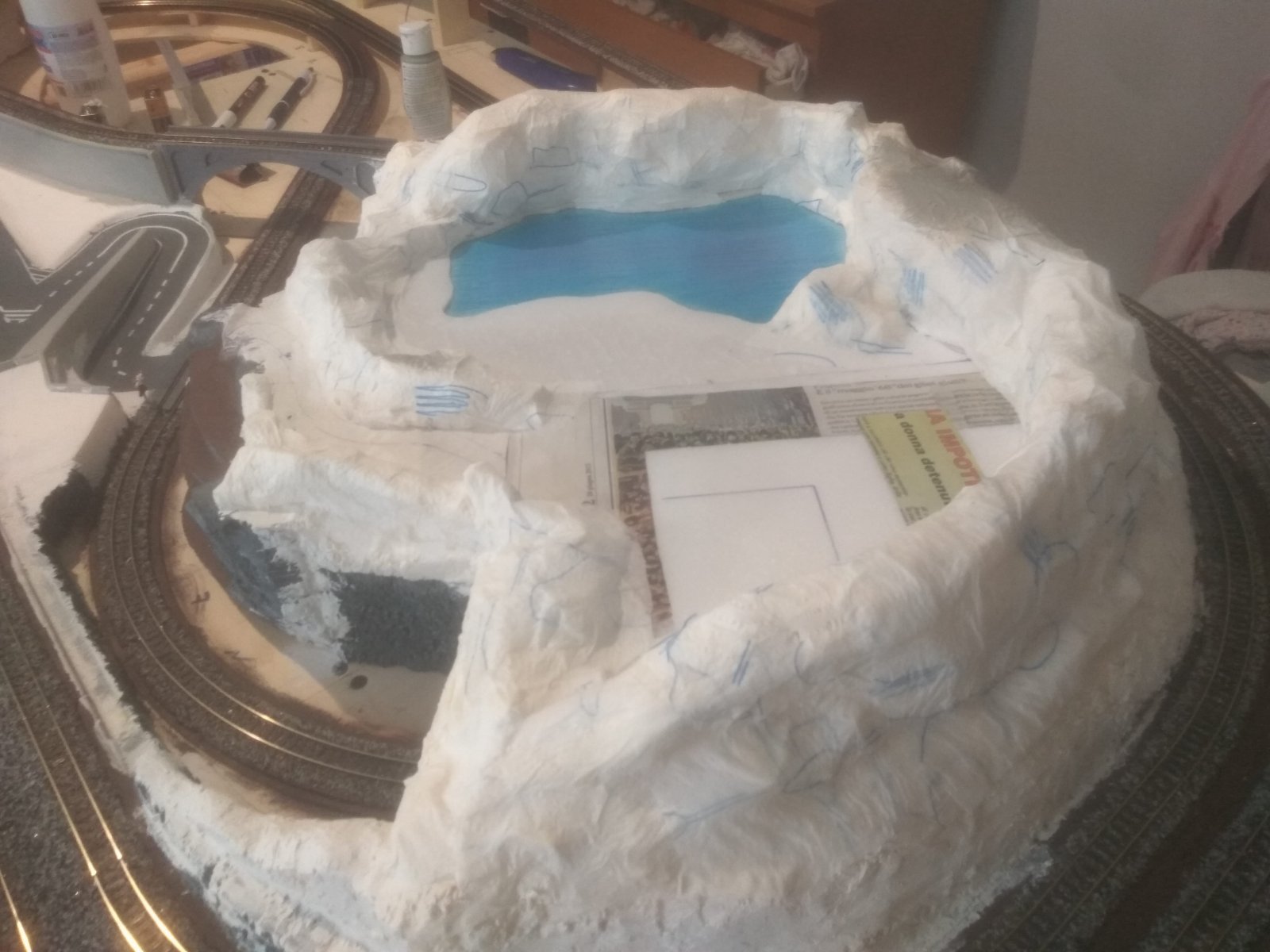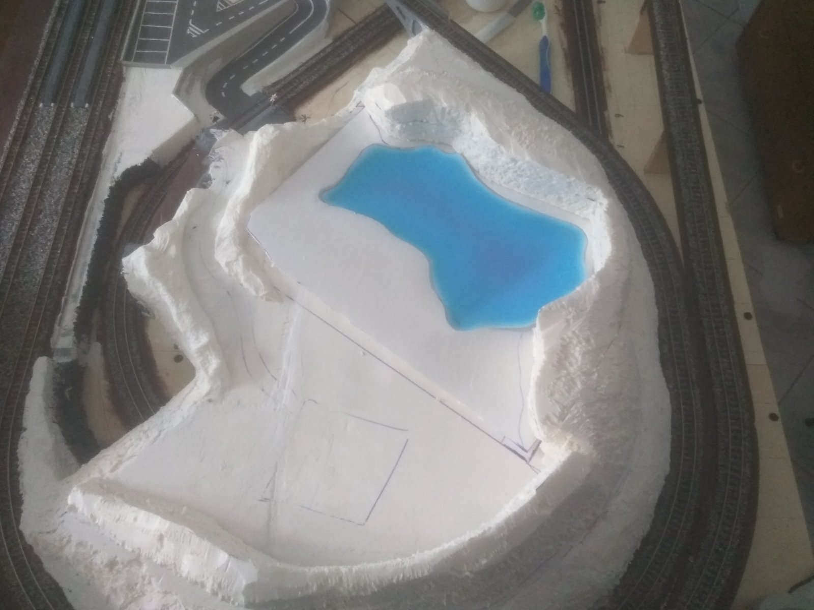 Sicuramente nella parete interna della montagna sul laghetto agirei con pezzettini polistirene e carta per realizzare roccie a forma levigata e sicuramente qualche altra roccia lungo la riva.