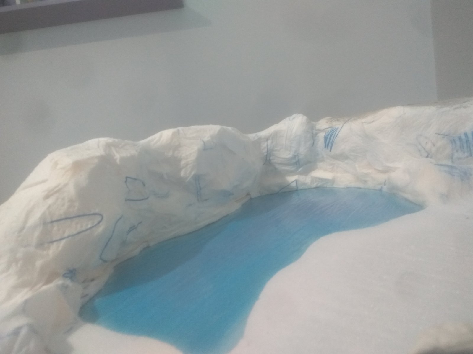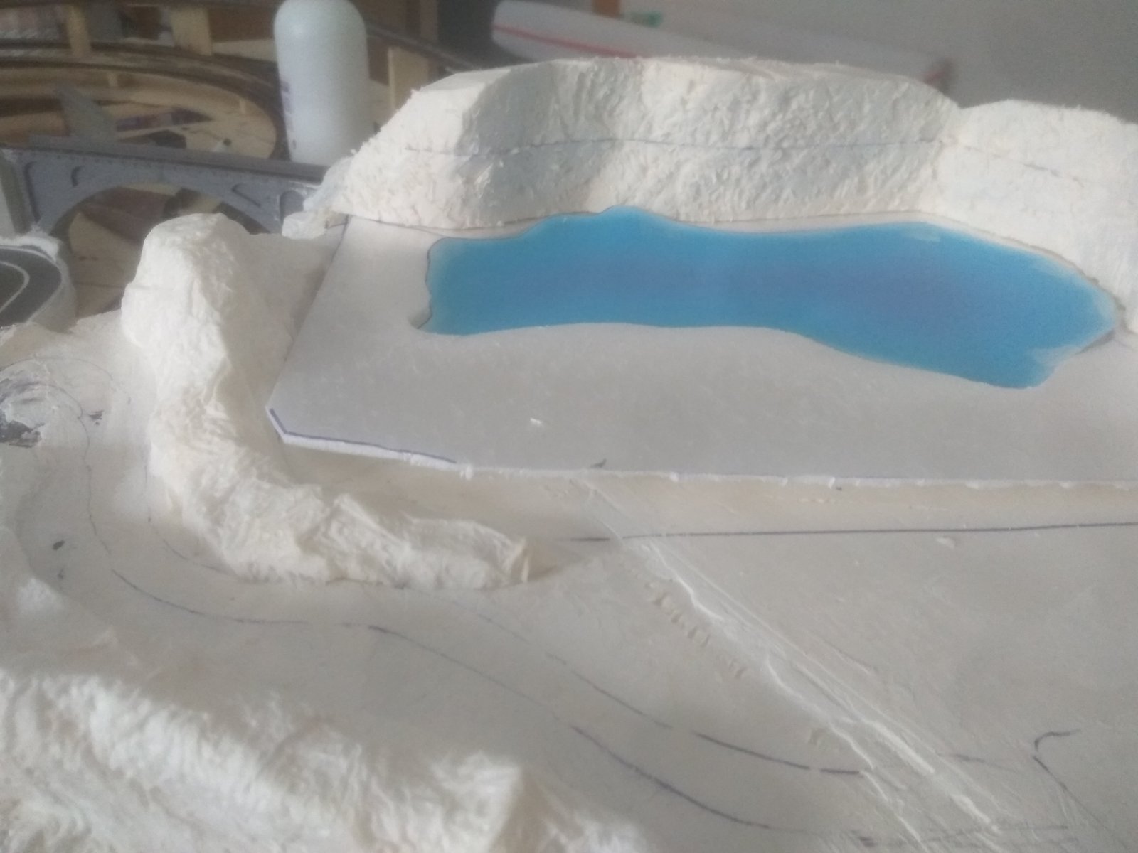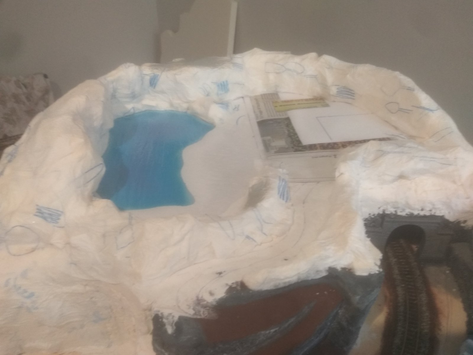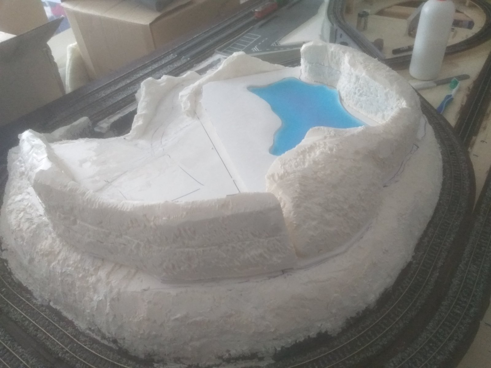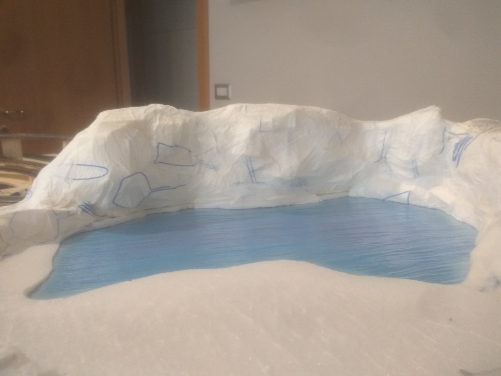 Sicuramente nella parete interna della montagna sul laghetto agirei con pezzettini polistirene e carta per realizzare roccie a forma levigata e sicuramente qualche altra roccia lungo la riva.
