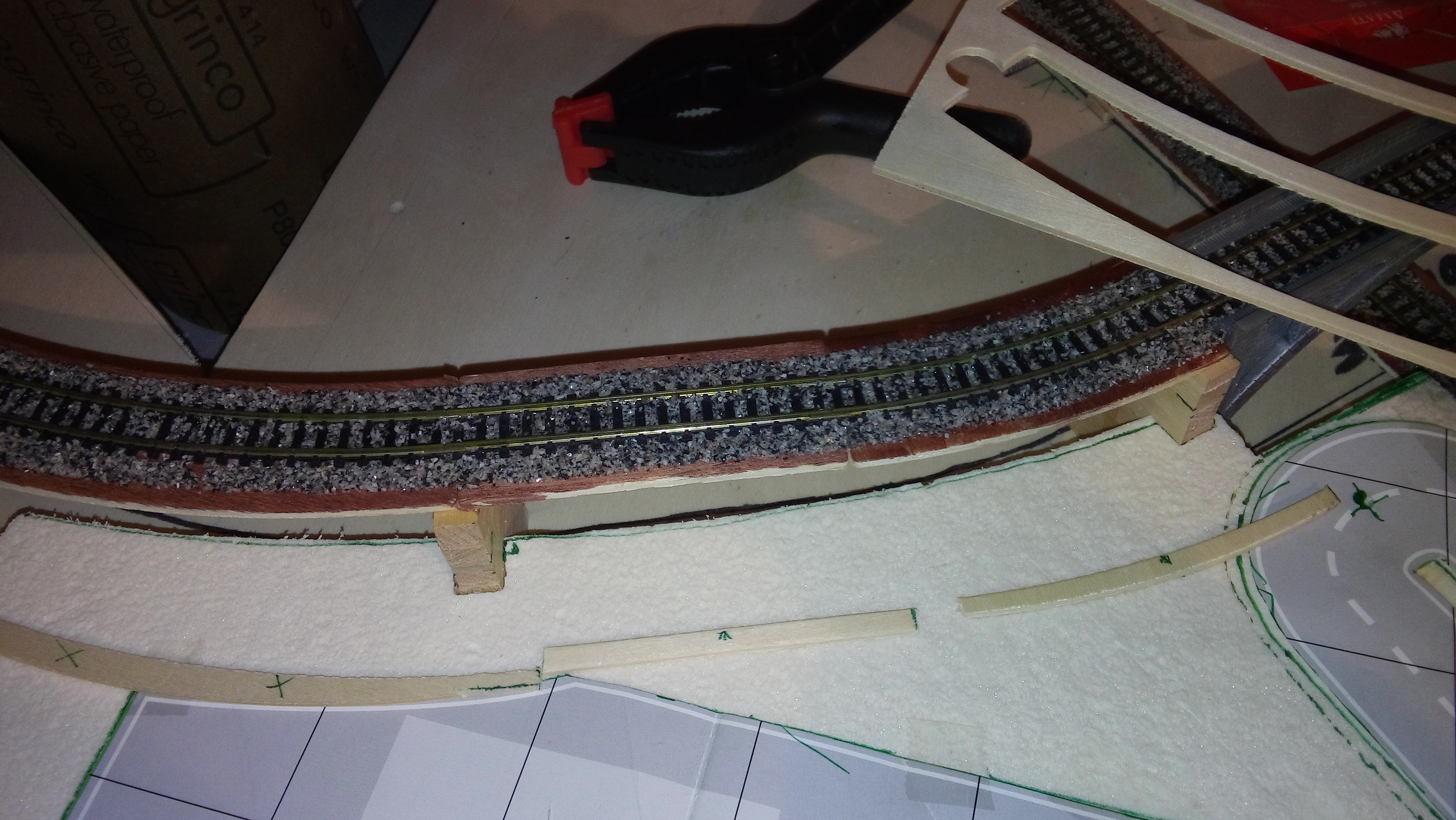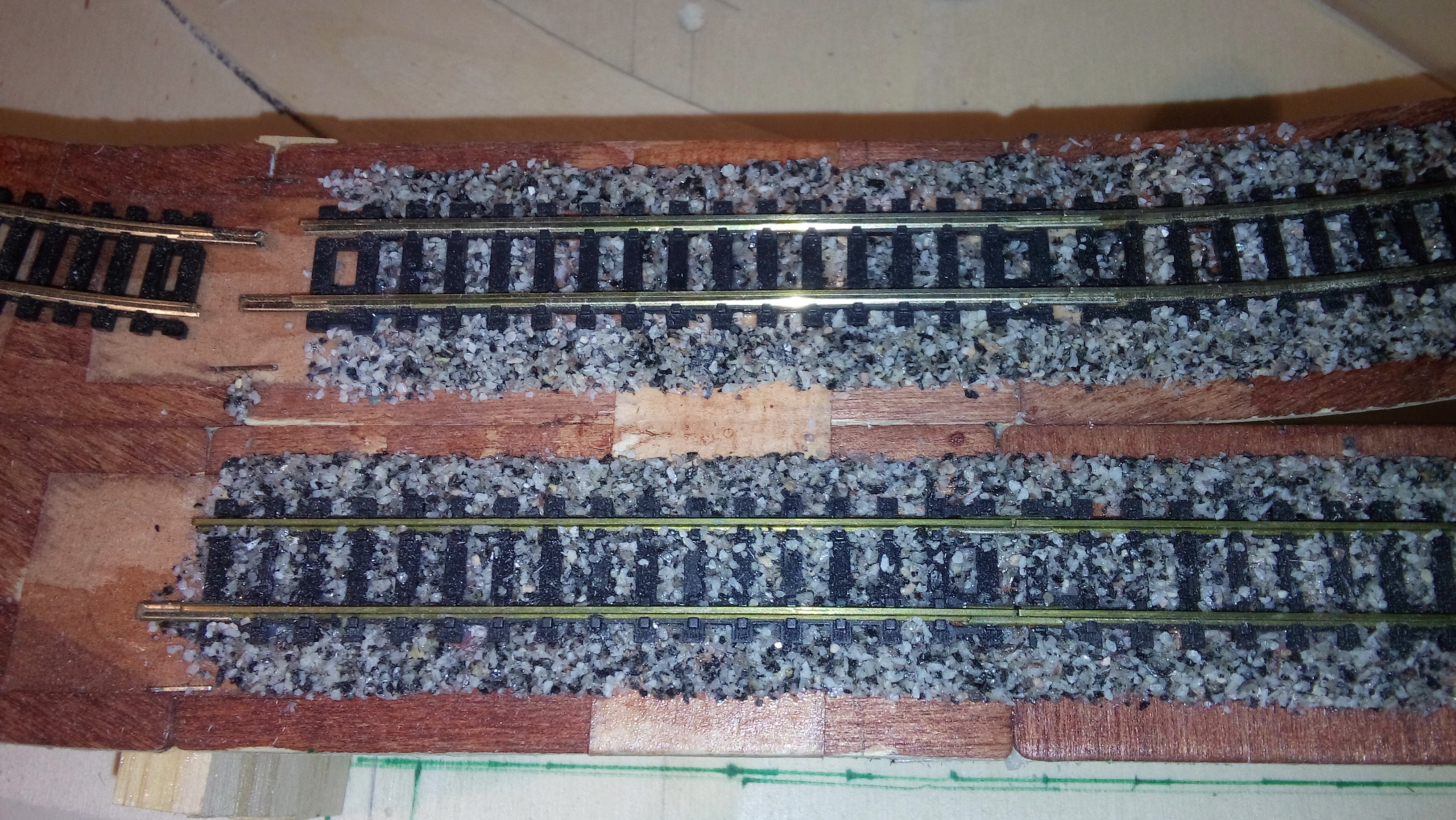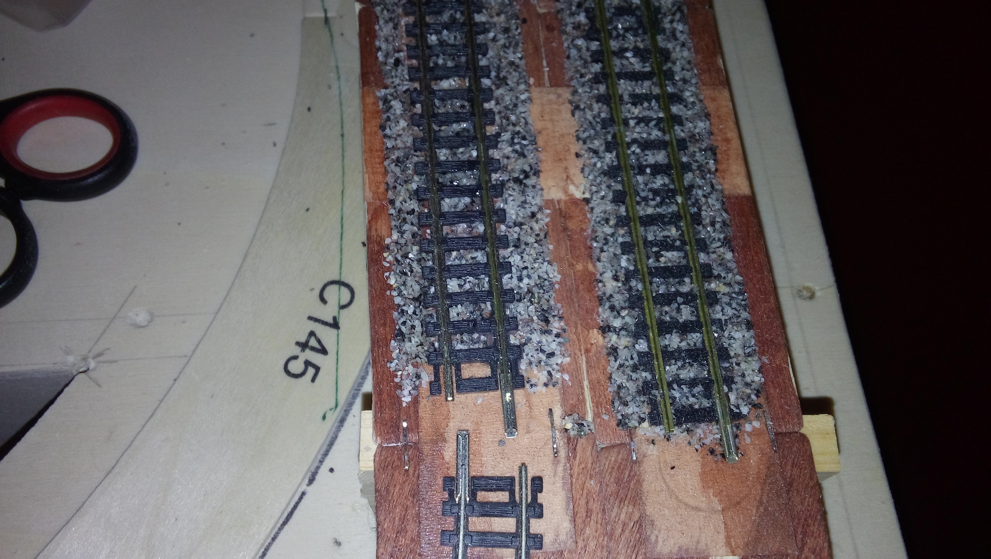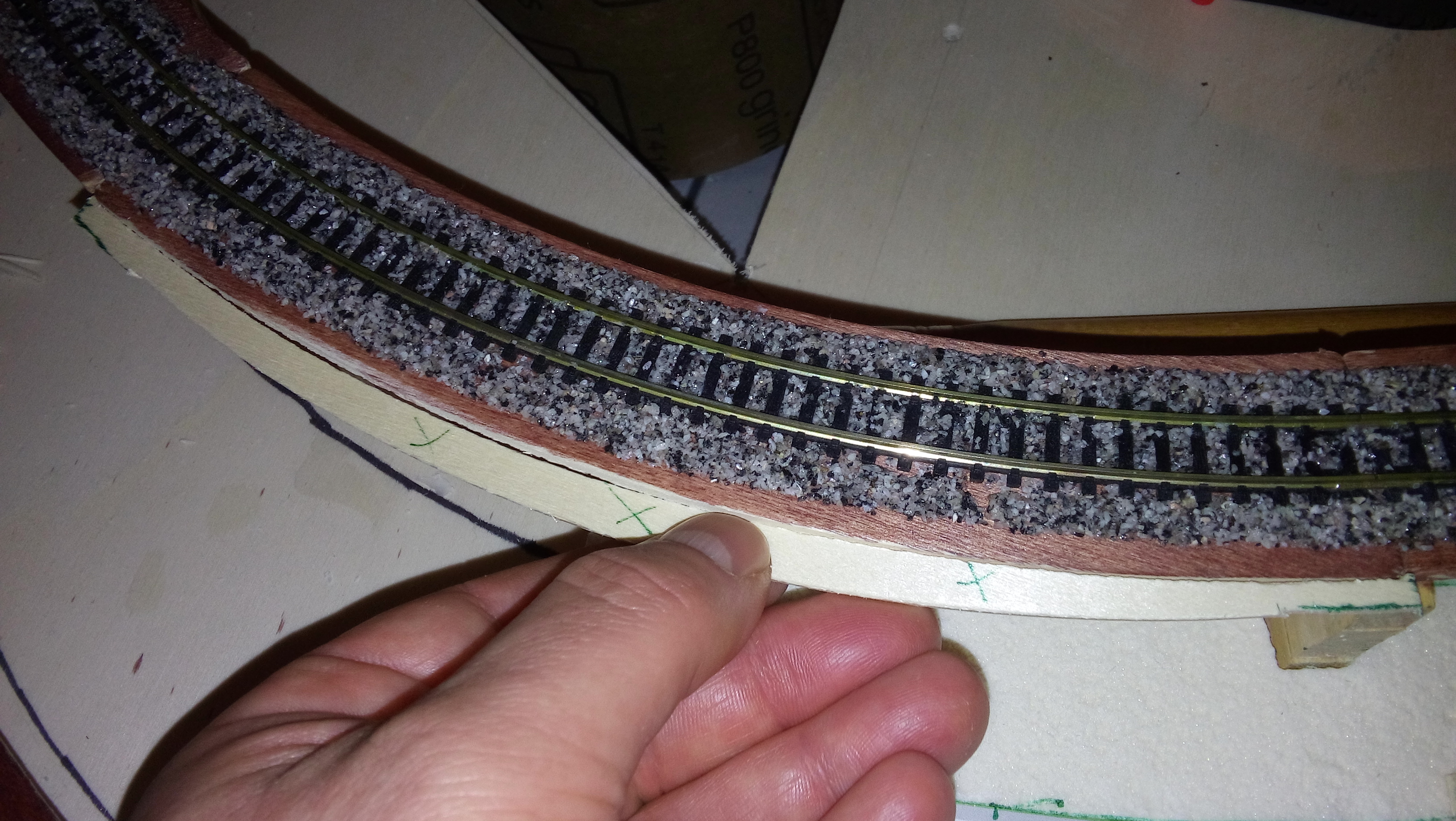 A parte l'elemento sul passaggio a livello non ho fissato ancora niente definitivamente, infatti il restante tracciato l'ho "fermato" tramite chiodini 7x0.9mm, quando sarò sicuro che il tracciato è correttamente posizionato fisserò il tutto mediante l'incollaggio del ballast (acqua, colla vinilica, sapone)