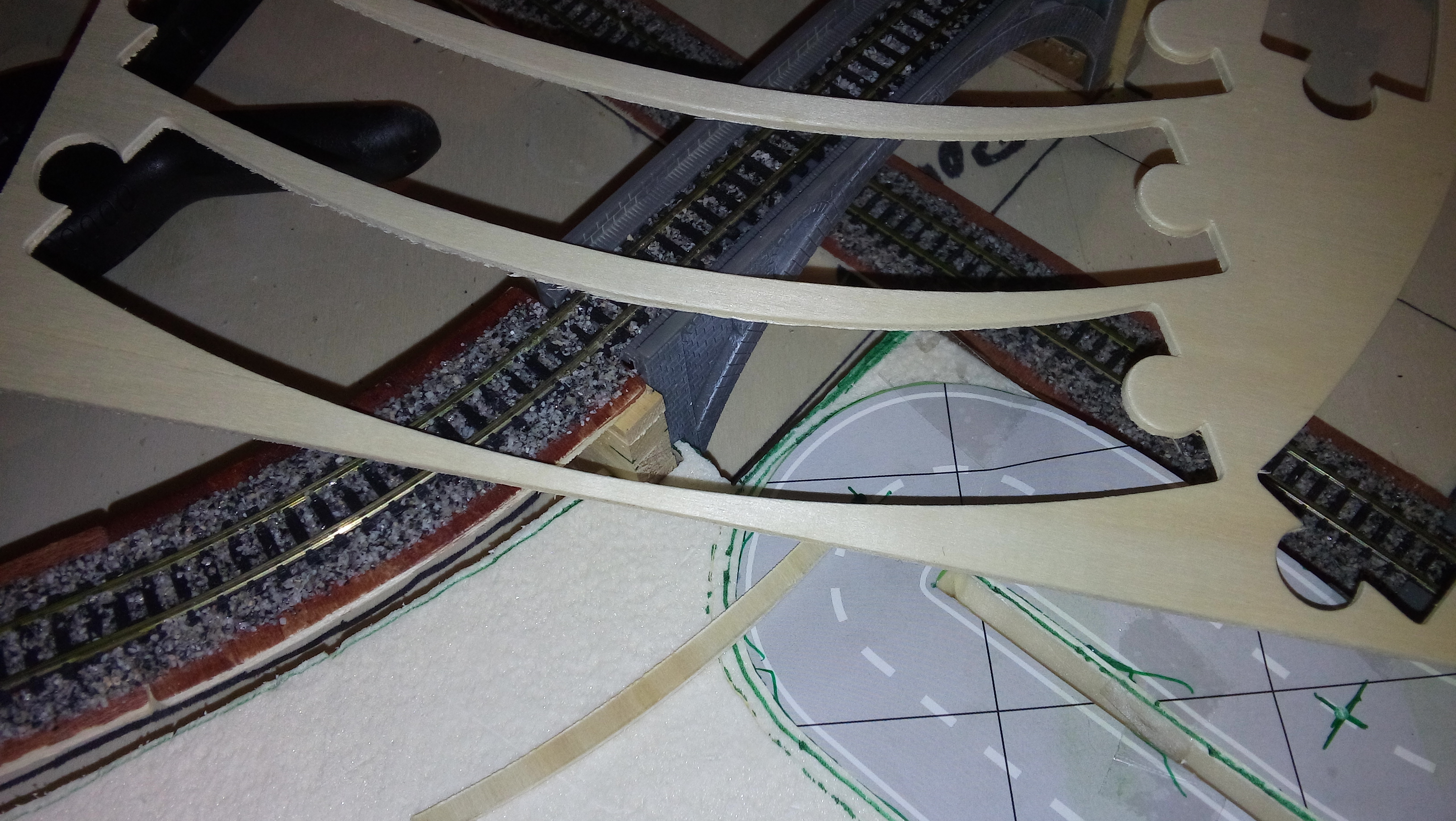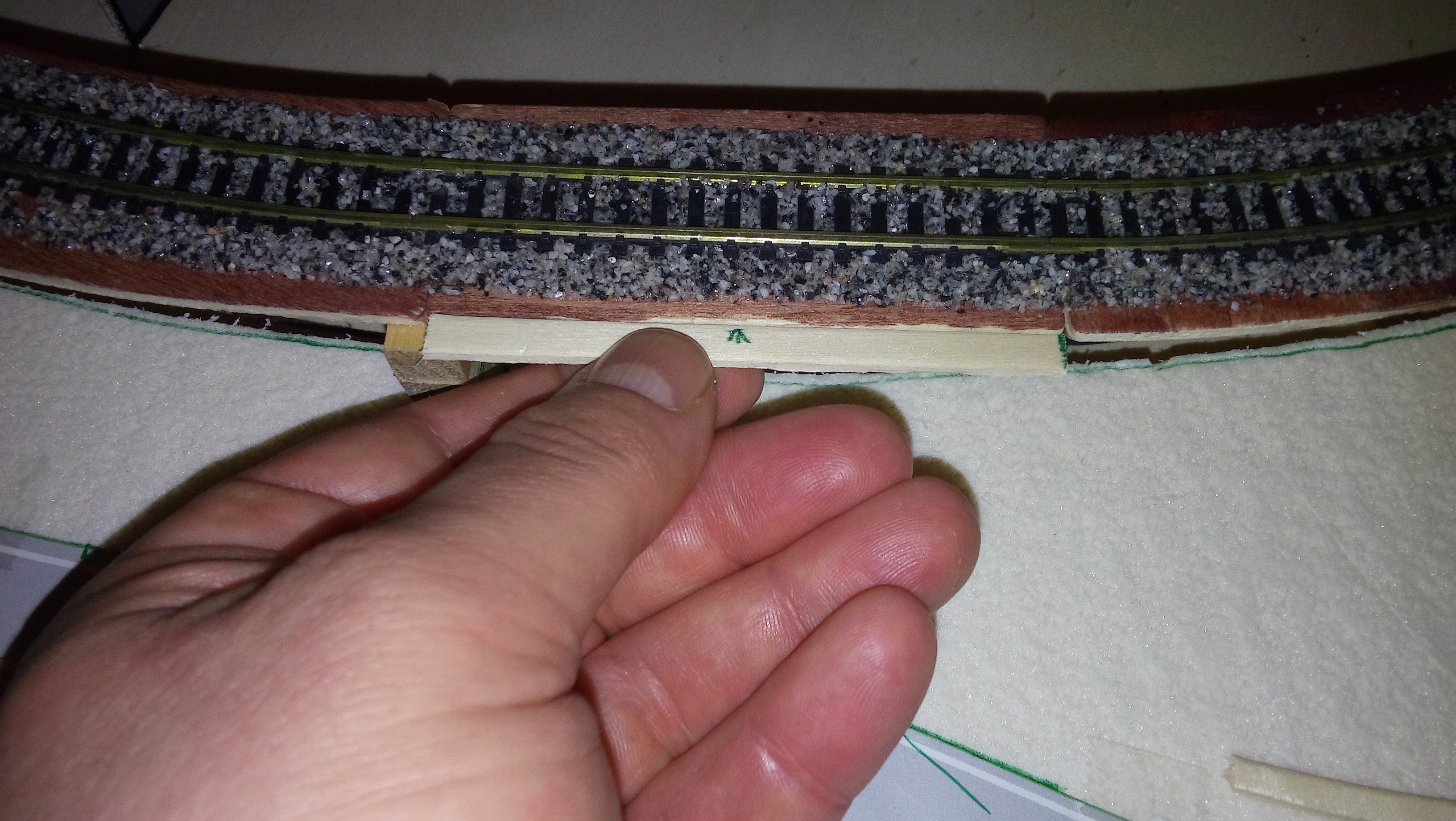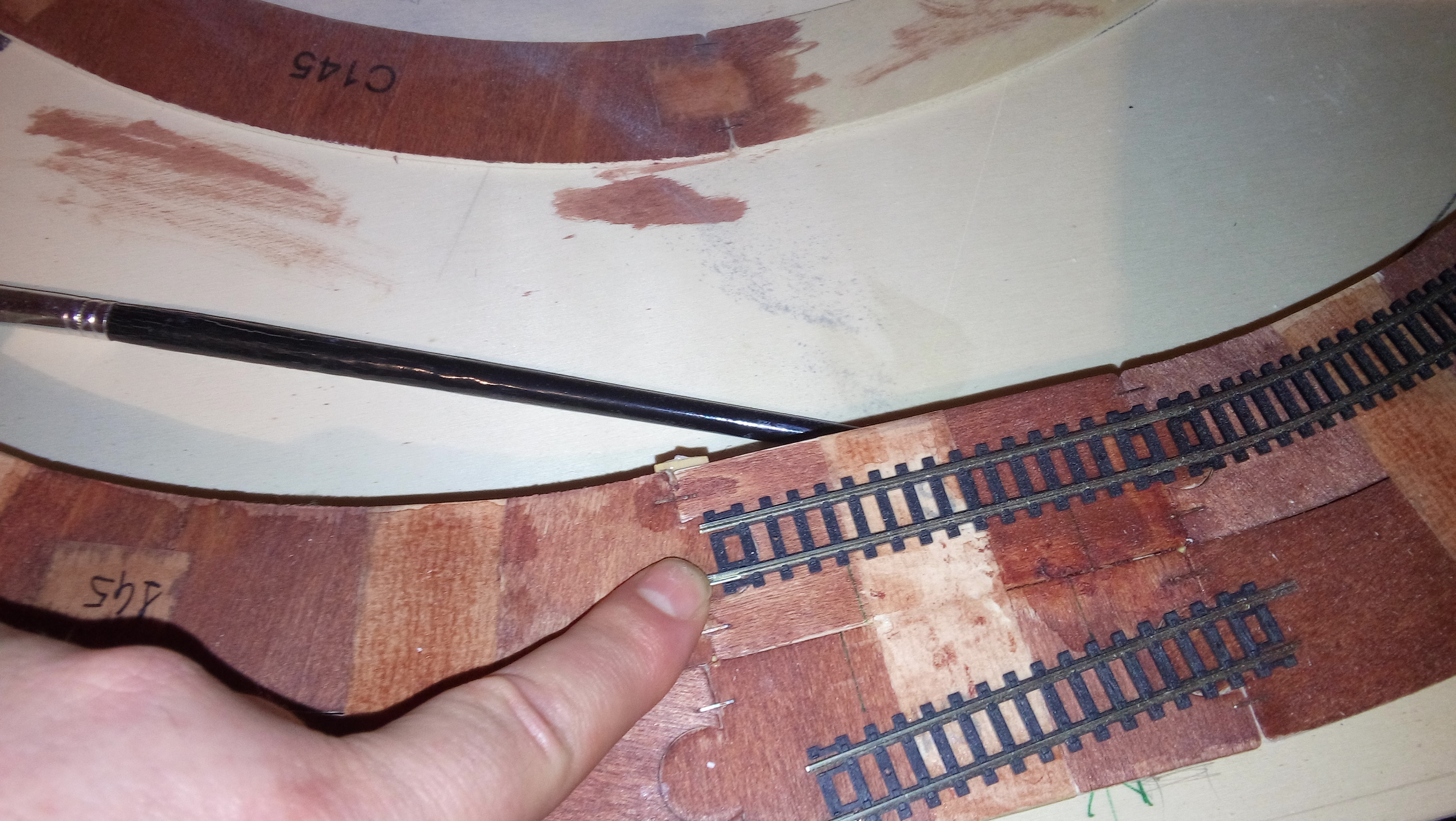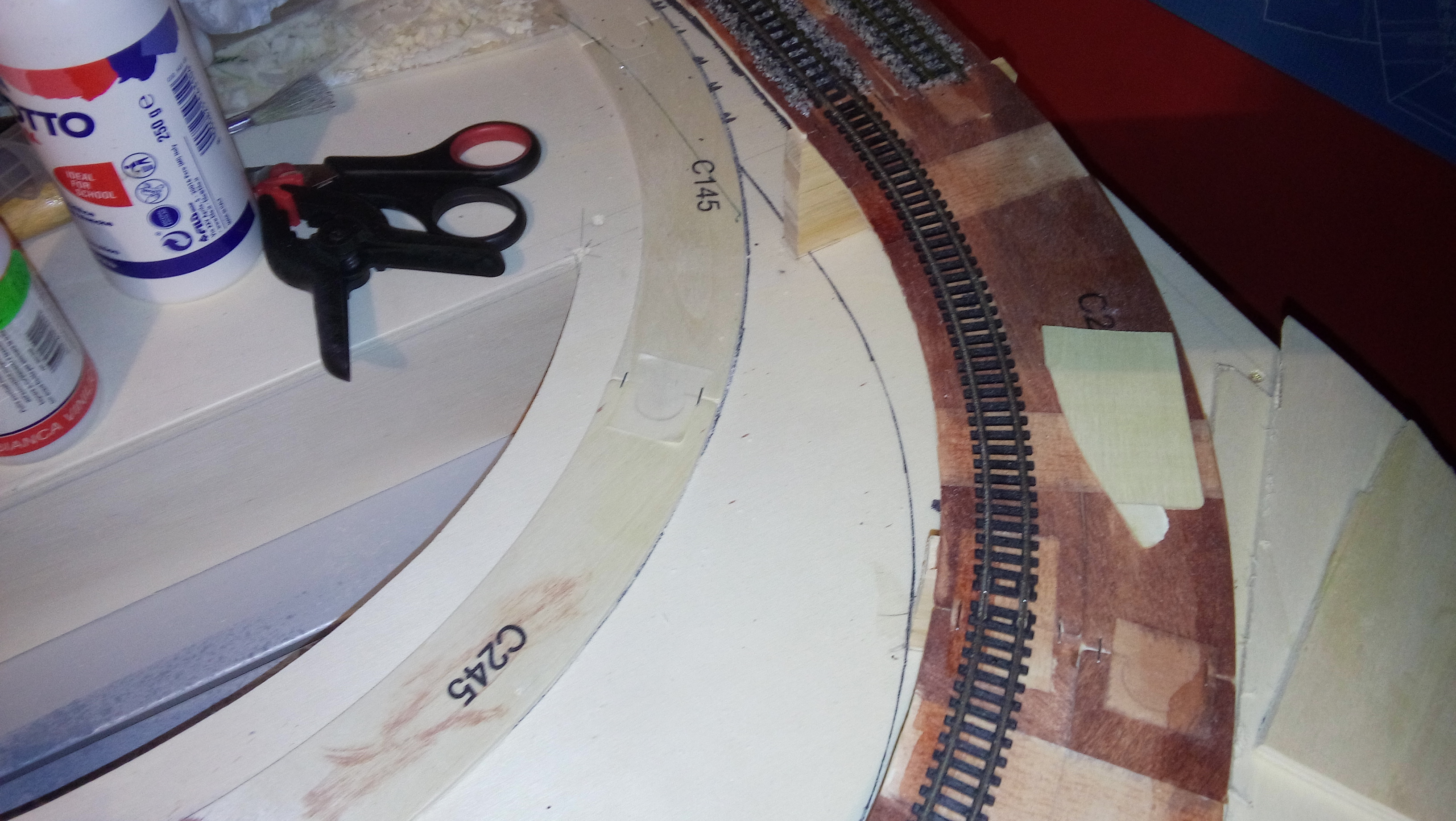 A parte l'elemento sul passaggio a livello non ho fissato ancora niente definitivamente, infatti il restante tracciato l'ho "fermato" tramite chiodini 7x0.9mm, quando sarò sicuro che il tracciato è correttamente posizionato fisserò il tutto mediante l'incollaggio del ballast (acqua, colla vinilica, sapone)
