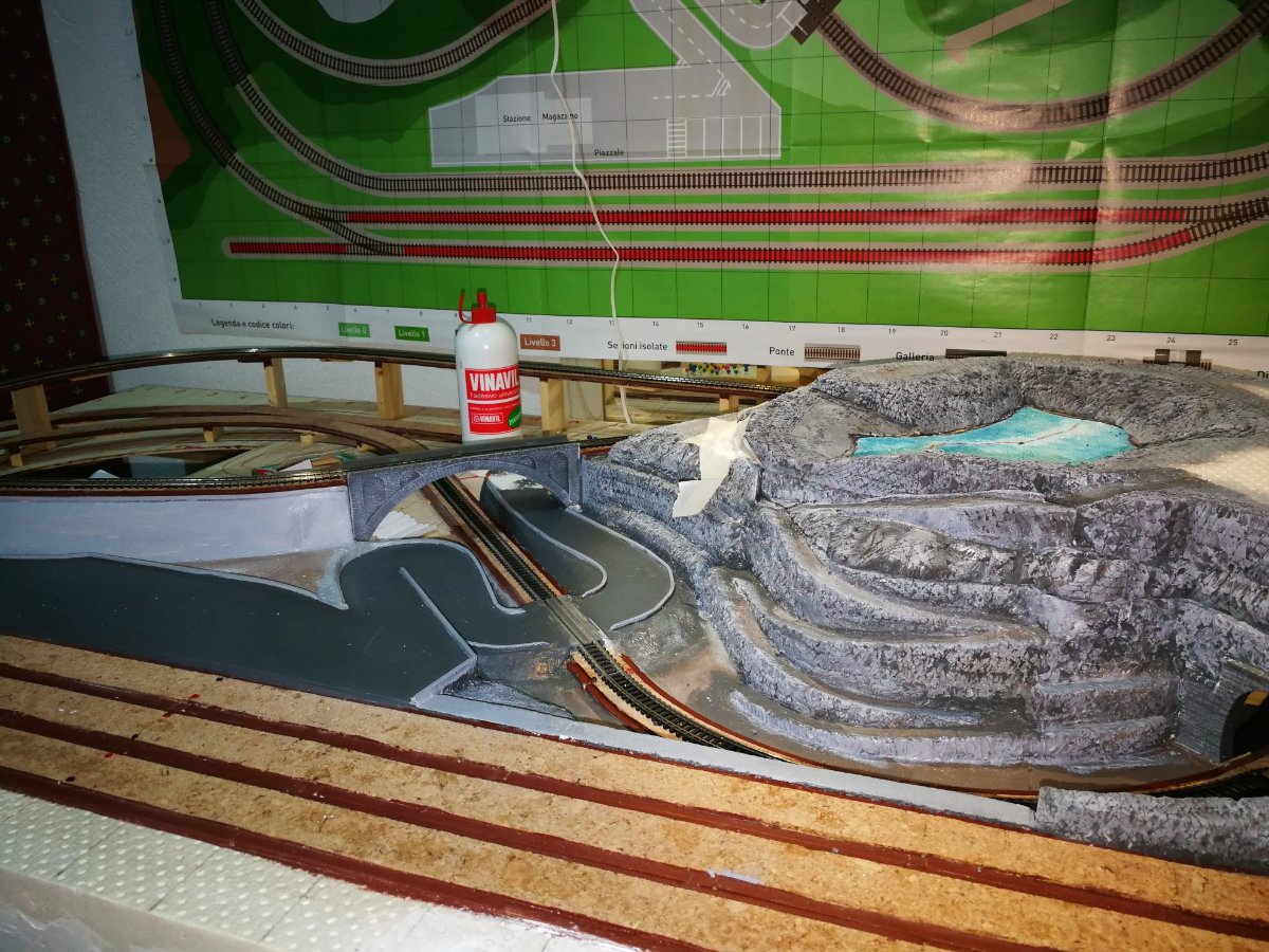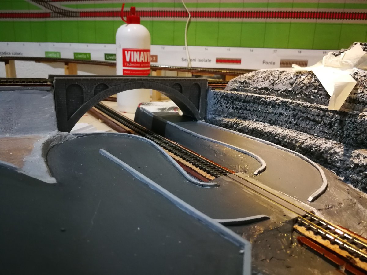 Dopo un periodo di relativa pausa ho ripreso la costruzione, principalmente mi sono dedicato finitura della curva a valle del passaggio a livello, alla pittura della strada, ed allo sbiancamento delle rocce