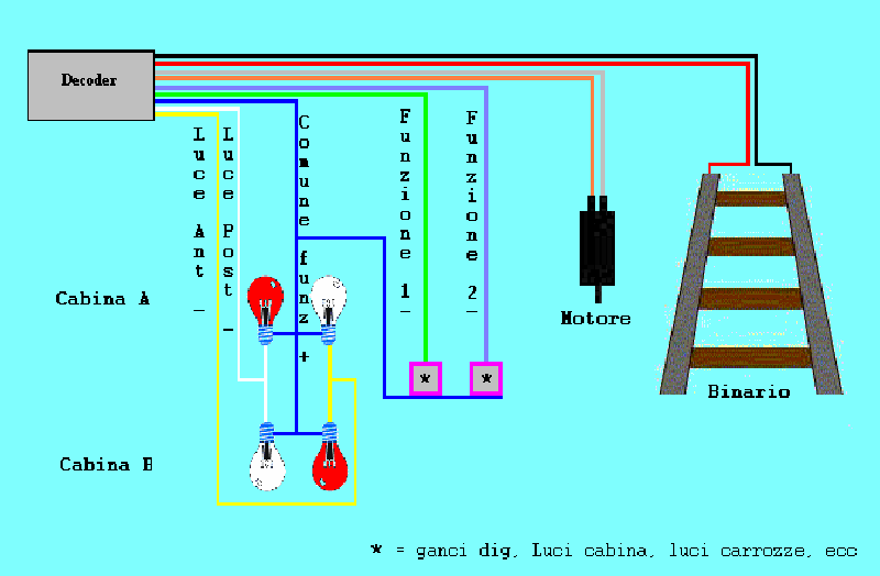 Questo è uno schema dei collegamenti di un decoder, come puoi vedere il filo blu che è in comune sulle luci è il positivo, il giallo ed il bianco sono i rispettivi negativi