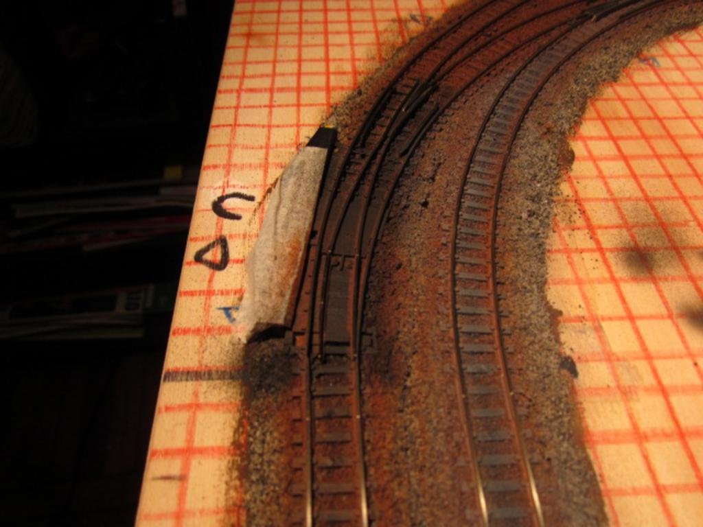 In alternativa con un pennellino sottile si può mettere della vaselina nei punti critici per poi rimuoverla con del cotone avvolto sui becchi di una pinzetta , purtroppo se sui deviatoi si vuole realizzare la classica alonatura nera del grasso al centro dei deviatoi utilizzando l'aerografo rimane utile solo il secondo sistema fortunatamente i deviatoi in enne digeriscono bene i lavori ad aerografo ecco cosa si può fare qui ho lavorato su deviatoi Minitrix