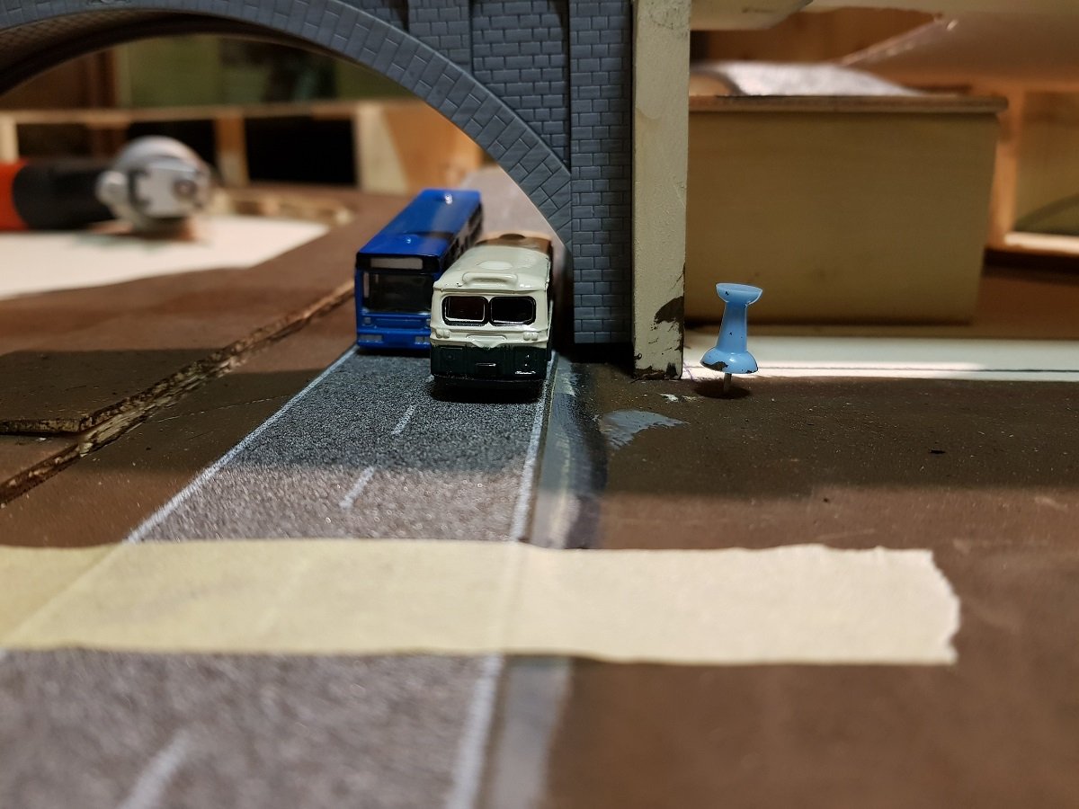 A mio parere i veicoli sono troppo vicini uno all'altro....io ho fatto la prova su una strada del mio plastico,rispettando le misure della DeA, ossia i 39mm della carreggiata, i veicoli sono a circa 6/7 mm uno dall'altro....credo che hai la possibilità di allargare la carreggiata....