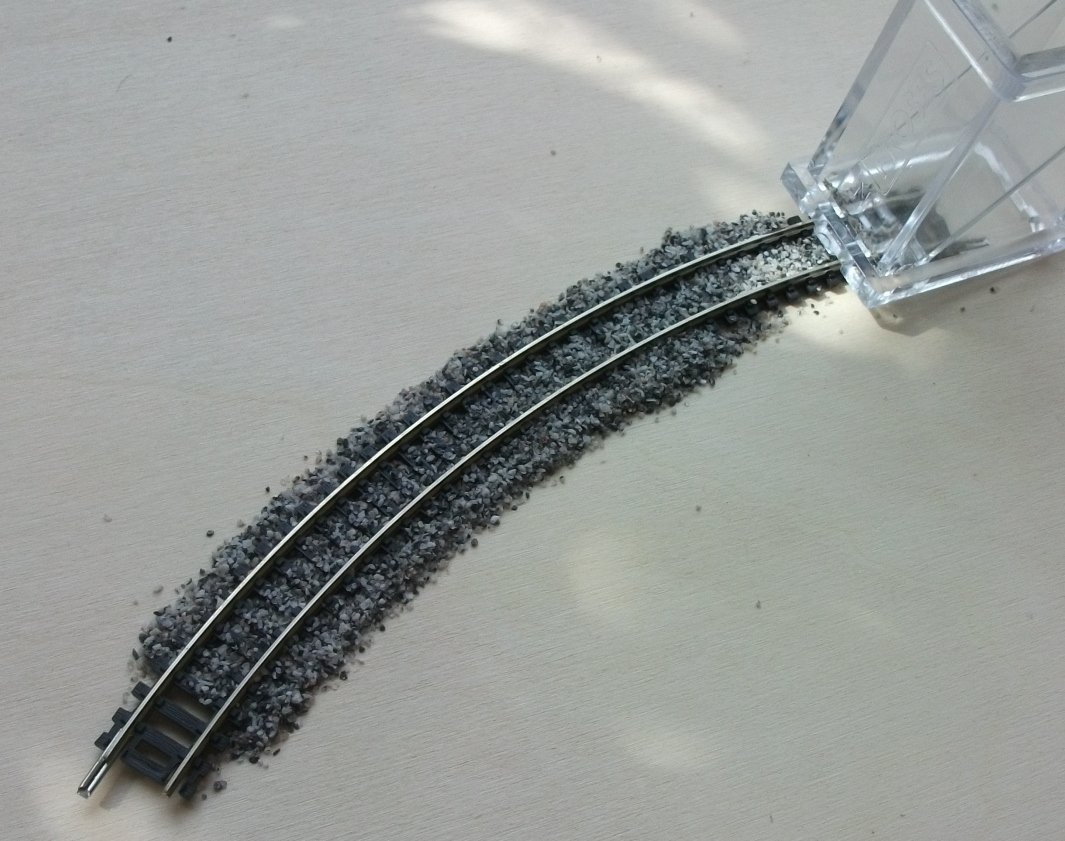 ....ho avuto anch'io questa difficoltà....ho risolto posando inizialmente la miscela solo sul ballast tra le traversine....e dopo, circa una mezzoretta, sul ballast ai lati delle rotaie.....fare ciò, la miscela, fissa bene il ballast tra le traversine e quella in più si spande al di sotto del ballast ai lati delle rotaie senza farlo franare e quindi tenerlo in posizione [102]