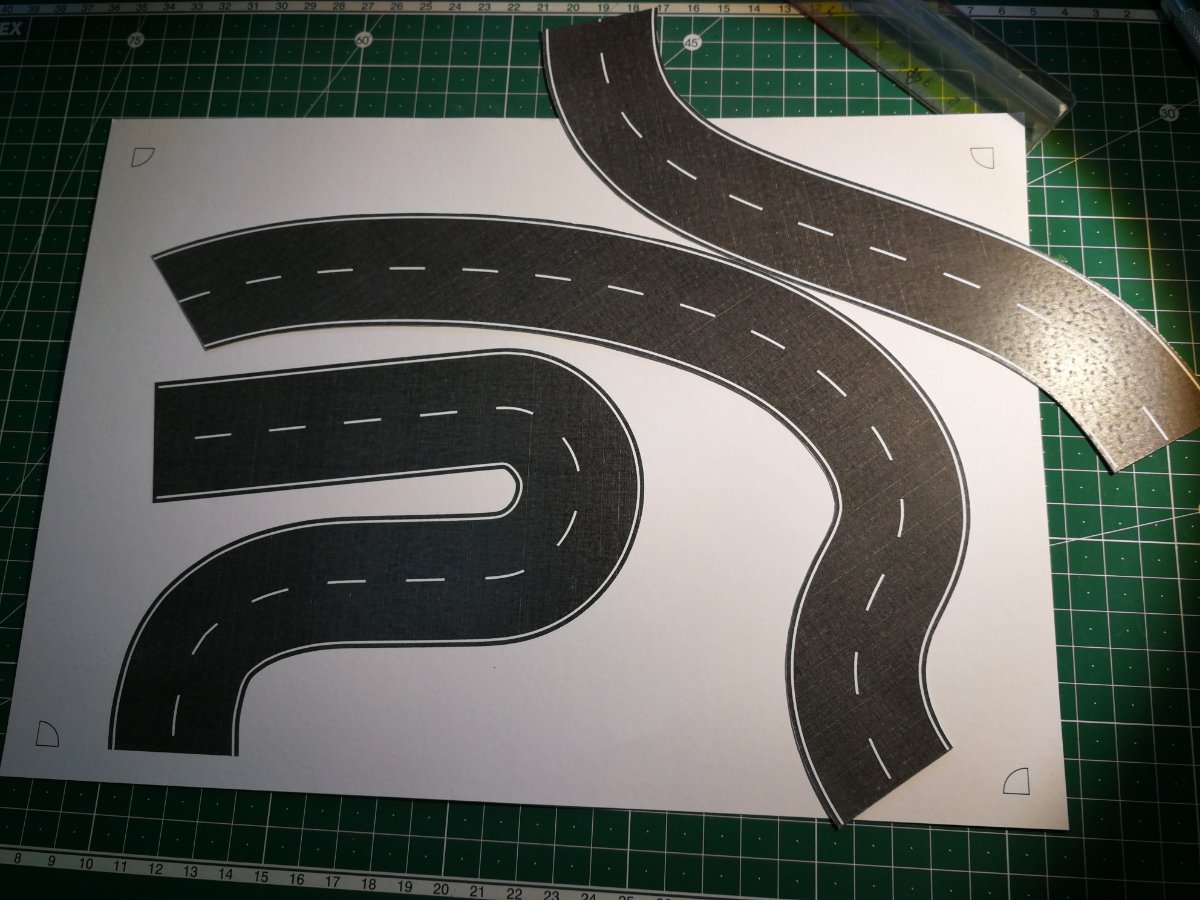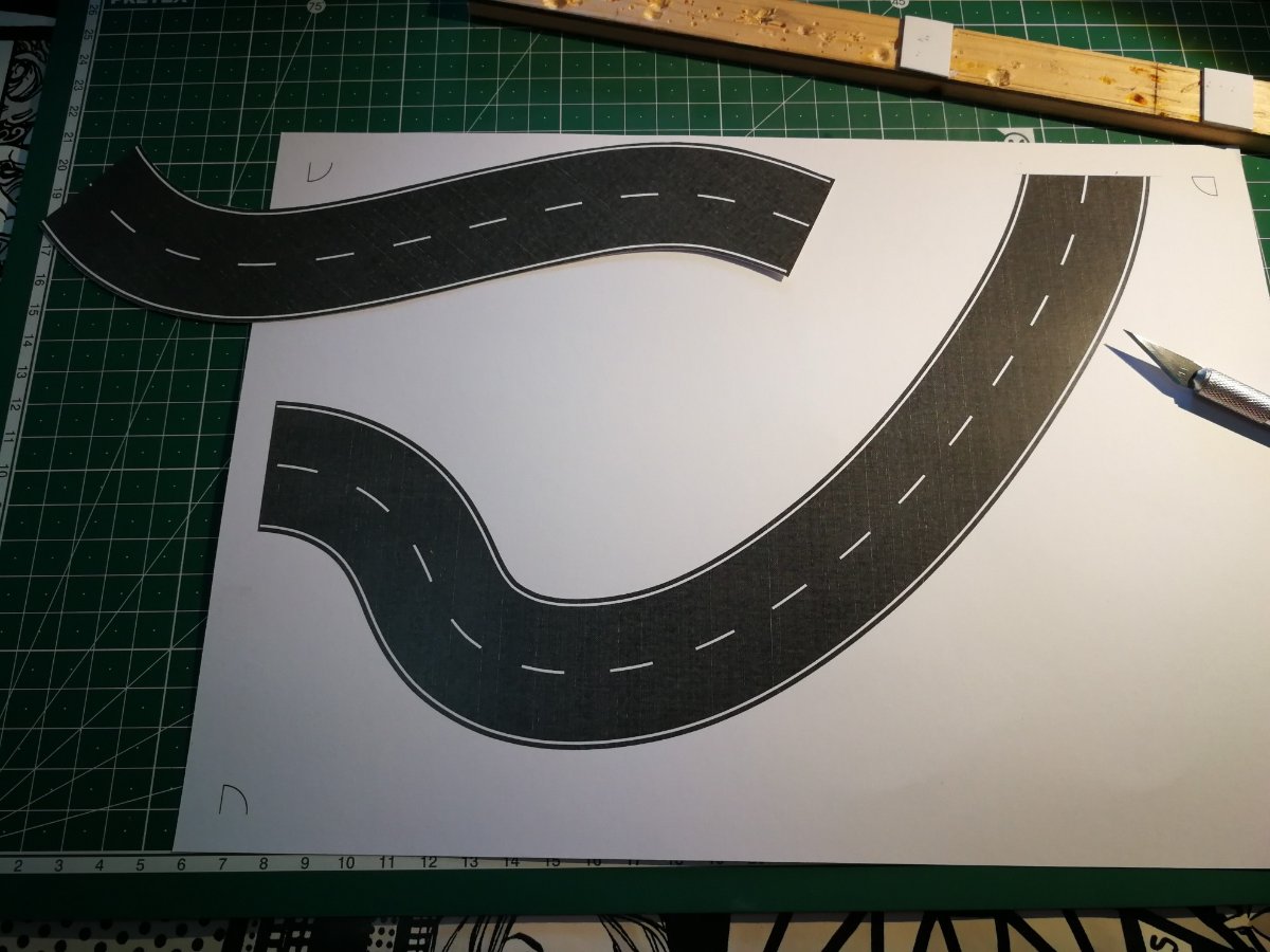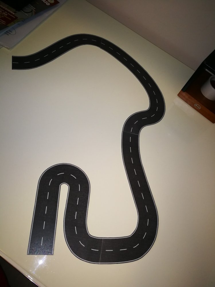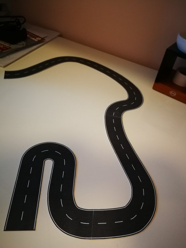 È stato un lavoro lungo e laborioso, partendo dal tracciato originale, dopo averlo ritagliato e posizionato sul plastico, l'ho modellato con una serie di taglia e cuci con carta e nastro per carrozzieri, una volta definito l'ho "montato" su due fogli in formato A3 per avere i riferimenti successivamente ho scannerizzato i fogli A3 con il tracciato, se non si possiede lo scanner A3 può essere fatto in A4 ma con 4 fogli, creati i 2 file jpg con la scannerizzazione li ho uniti in un unica immagine con un software di grafica, fatto questo ho utilizzato AutoCAD e dopo aver importato il file del tracciato come immagine raster l'ho ridimensionata ed adattata seguendo i riferimenti dei formati, in questo caso A3, della scansione, a questo punto ho disegnato la strada completa di strisce segnaletiche seguendo l'immagine di sfondo, fatto questo ho stampato il tutto su cartoncino bianco, la stampa l'ho fatta in A4 perché non avevo cartoncino A3, terminata la stampa ho ritagliato le sagome della strada, ora non mi resta che provare l'effetto sul plastico [102]