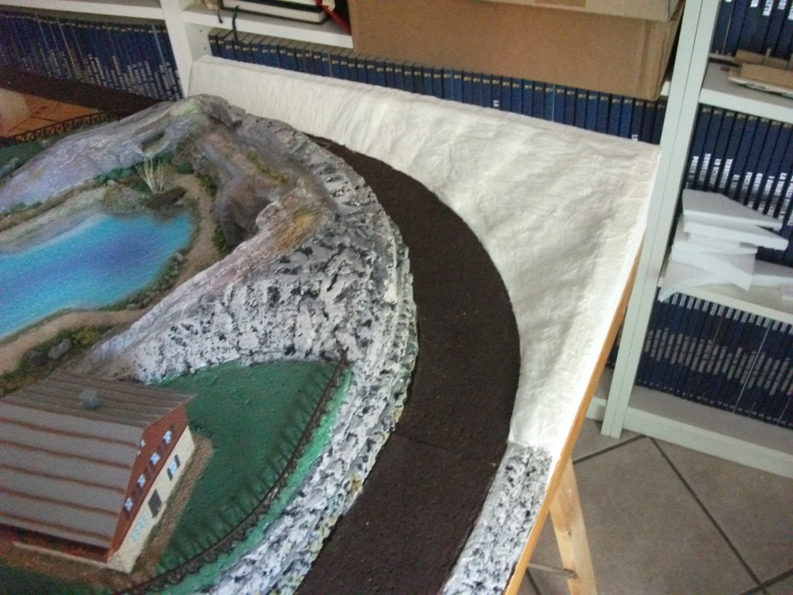 Alceo puoi fare anche cosi ma ti consiglio, una volta sagomati i pezzi che simulano le rocce, di ricoprire tutto con la carta, tanto i dettagli ricreati si vedono ugualmente, inoltre hai maggiore robustezza e si colora meglio