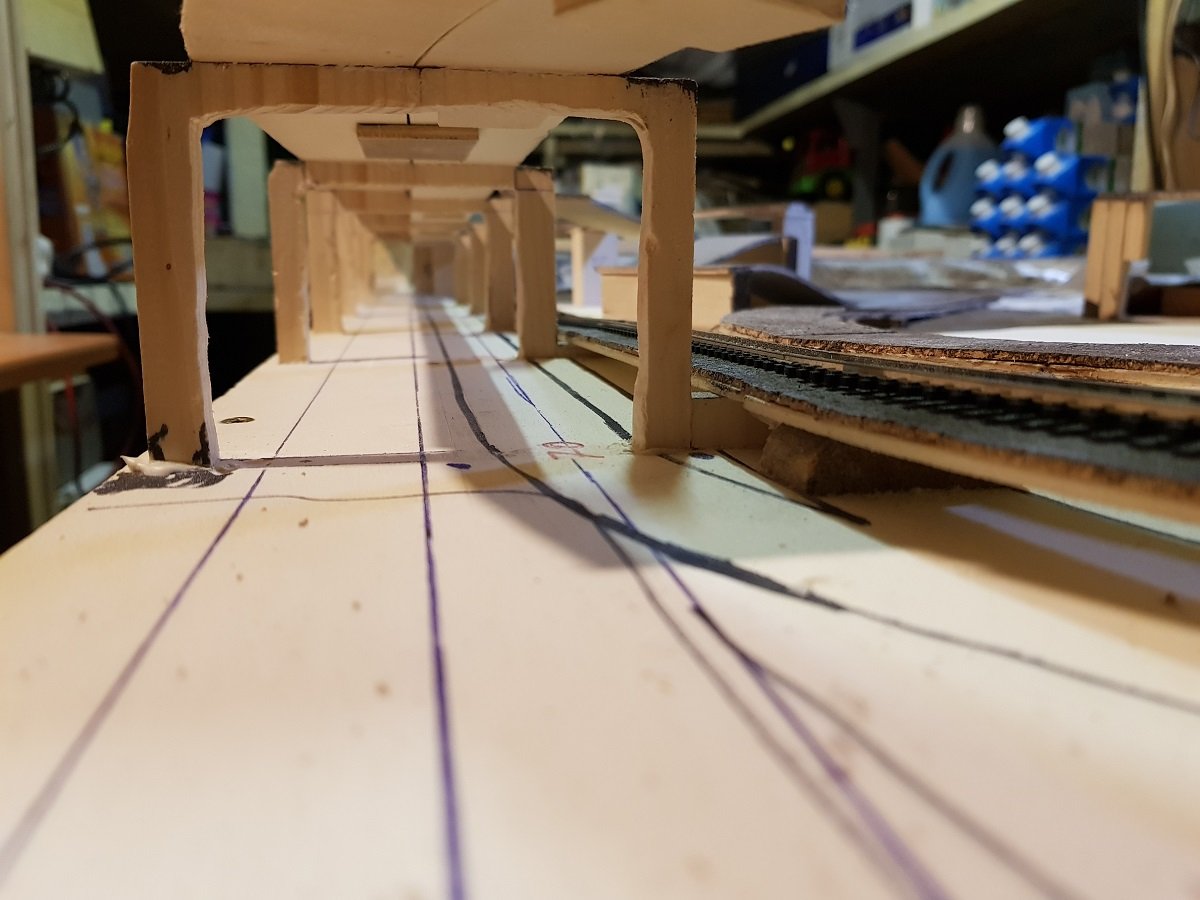 Mettendo un 3° binario e altri 2 scambi sotto i piloni, potrei ottenere un secondo binario di sosta, ma la lunghezza si ridurrebbe credo a circa 50 cm...(credo insufficiente per un intero convoglio)