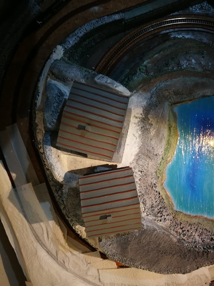 ...il pezzo evidenziato in blu presumo sia la base della zona fattoria...hai usato il poli o è un cartoncino già intagliato da mettere sotto le basi dei binari....incastrandosi quindi tra i piloni?....la zona evidenziata in giallo...sarà quella l'altezza della collina o intendi farla più alta?