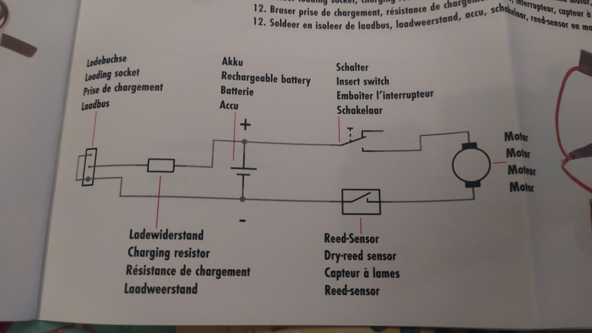In figura è possibile vedere che l'interruttore ed il reed sono collegati sui fili di alimentazione tra batteria e motore.