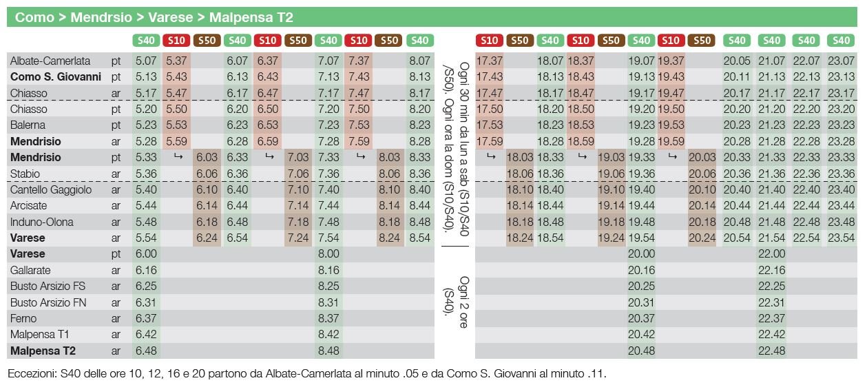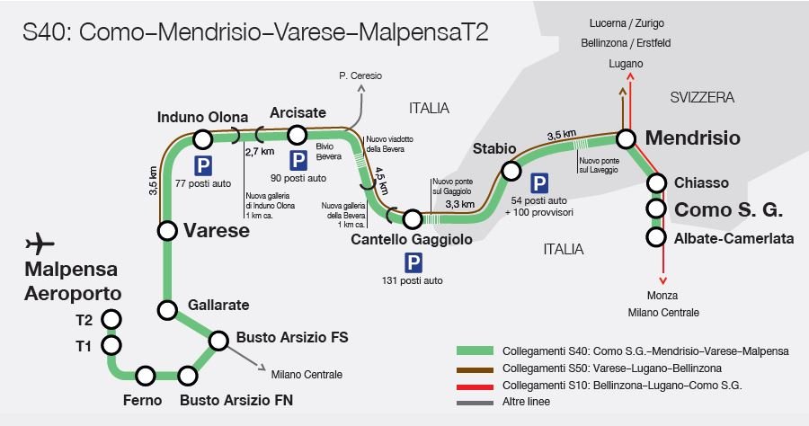 Saranno disponibili collegamenti diretti Albate-Carmelata (Como)-Mendrisio-Varese e Varese-Bellinzona. La frequenza massima del servizio è di un treno ogni 30 minuti.