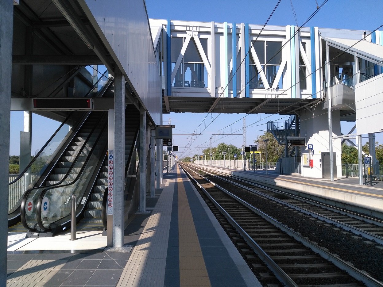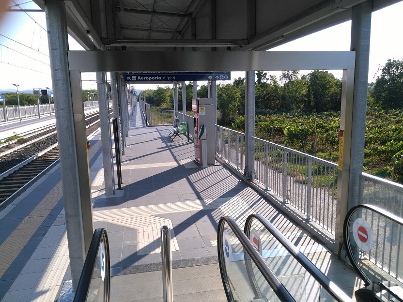 altezza 55 cm dal piano del ferro. L’accesso ai marciapiedi avviene tramite un sovrappassaggio pedonale dotato di scale, ascensori e sistemi tecnologici che consentono l’accessibilità alle persone con disabilità o mobilità ridotta. Tramite le passerelle, tutte coperte, è possibile accedere direttamente alla aerostazione e ai terminal dei bus.