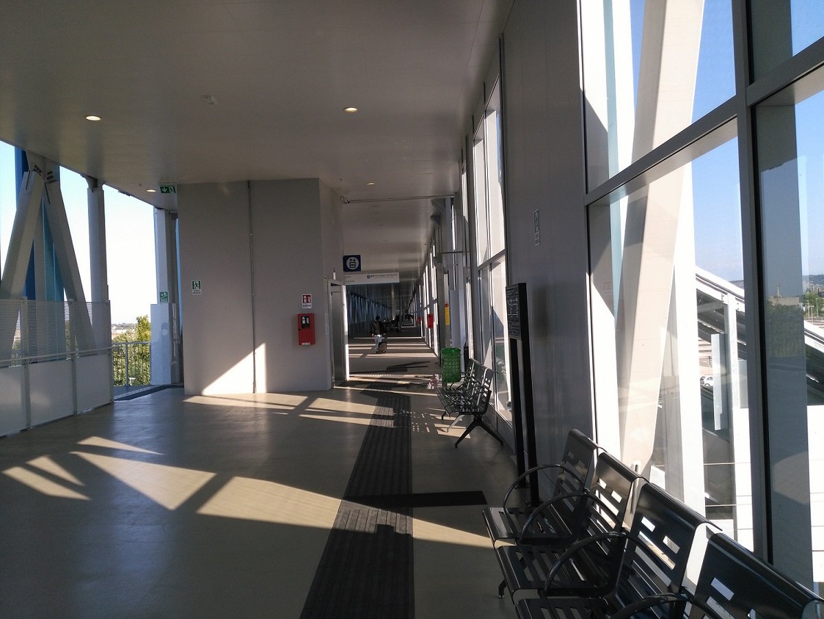Sono andato in una giornata di bora e, mentre entro il tunnel l'aria non era fastidiosa (è vetrato lato Bora e aperto dall'altro) una volta scesi dal tunnel si è accolti dalle folate: fatte alcune decine di metri si può entrare nell'area arrivi.