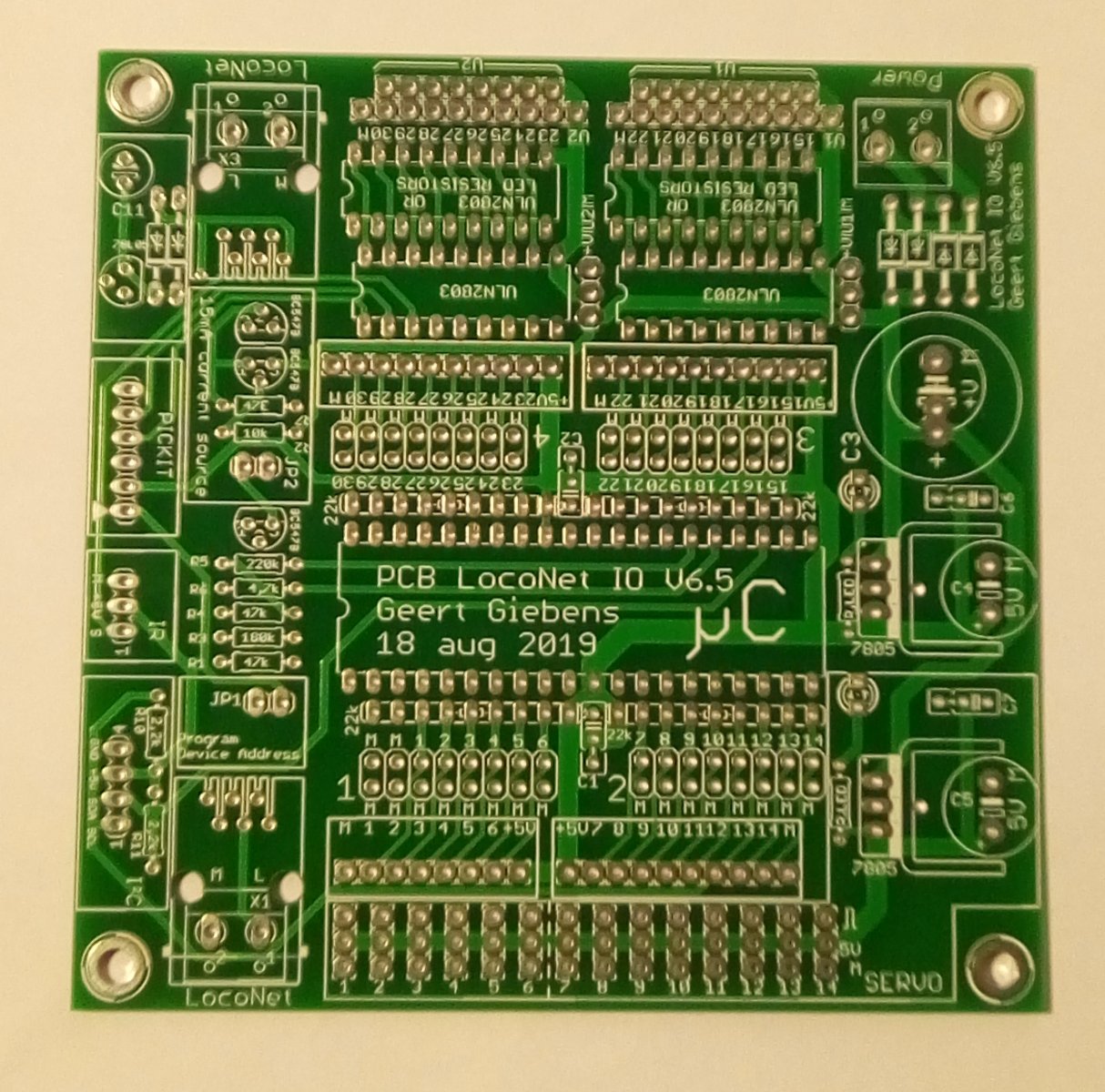 Sopra il PIC sempre i pin da 2 per collegare i Dupont, più sopra sempre i morsetti da PCB e la possibilità di inserire i c.i. ULN2803 per comandare gli scambi con bobine dal piedini 15 al 30, oppure inserire le resistenze per il led.