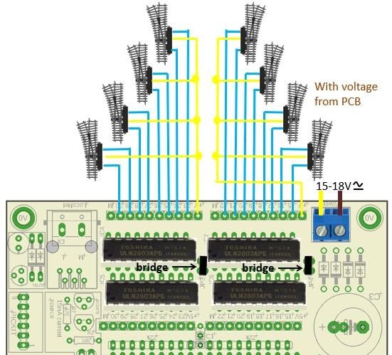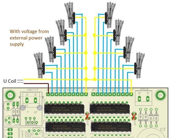 Il movimento degli scambi con bobine è possibile solo atrraverso l'uso di c.i ULN2803 che possono fornire fino a 500mA su ogni porta, è possibile metterne due in parallelo per arrivare a 1000mA.