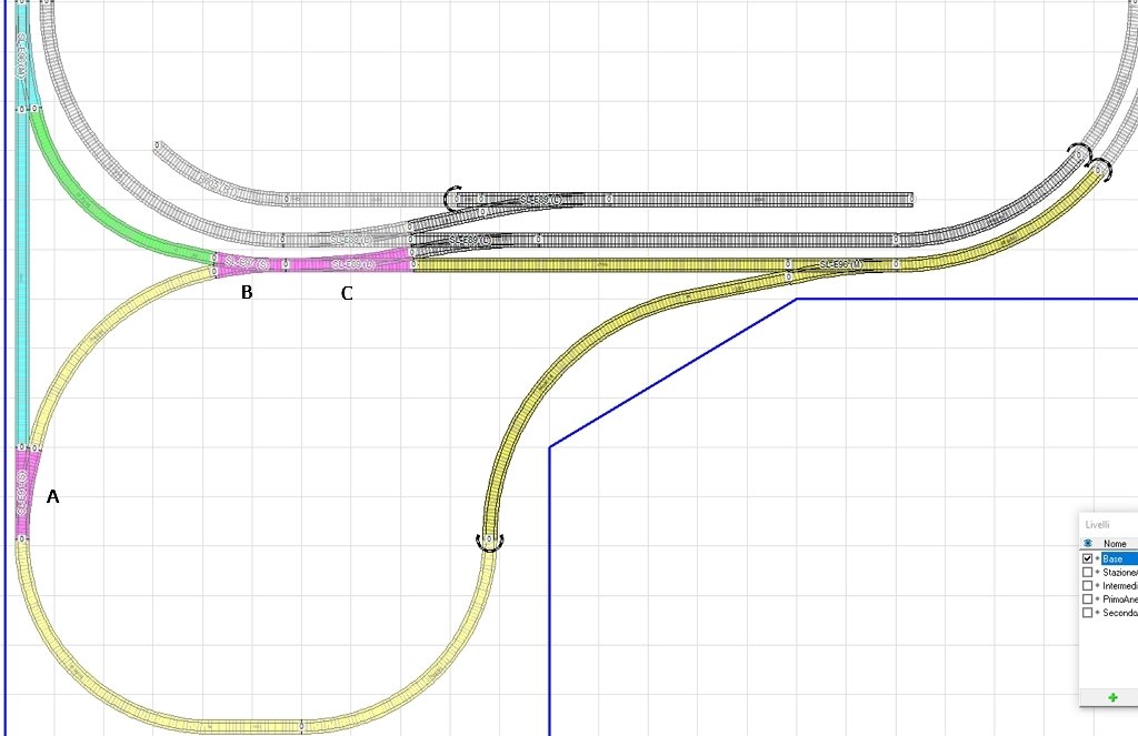 La situazione è abbastanza complessa perché del cappio di ritorno (quello in giallo) fanno parte tre deviatoi (evidenziati in viola) che conducono ad altre sezioni del tracciato. La parte verde è la connessione ad Y.