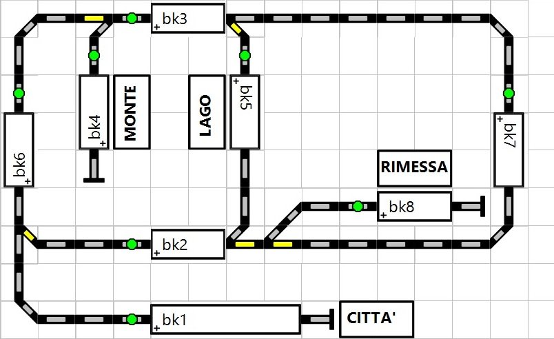 I blocchi terminali (RIMESSA, MONTE e CITTA’) sono configurati come stazioni di testa, i blocchi dell’anello circolare (bk2, bk3, b6 e bk7) sono configurati come di transito senza nessuna attesa e con possibilità di invertire il senso di marcia. Ogni blocco ha un solo sensore configurato come “enter2in” per ogni senso di marcia; la scelta di avere un solo sensore è data dal fatto che la marcia del convoglio sarà sempre lenta in quanto inserita in una scenografia che sarà il motivo di maggior interesse modellistico.