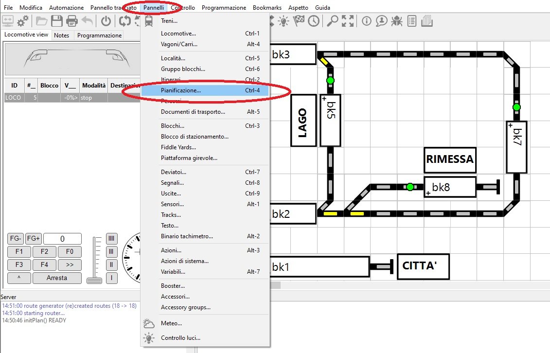 Dovremo quindi pianificare un percorso che preveda il movimento della loco dal blocco 8 ai blocchi 2 e 6, un’inversione di marcia nel blocco 6 e l’arrivo al blocco 1. Dal menù a tendina scegliamo “PANNELLI” e quindi “PIANIFICAZIONE”