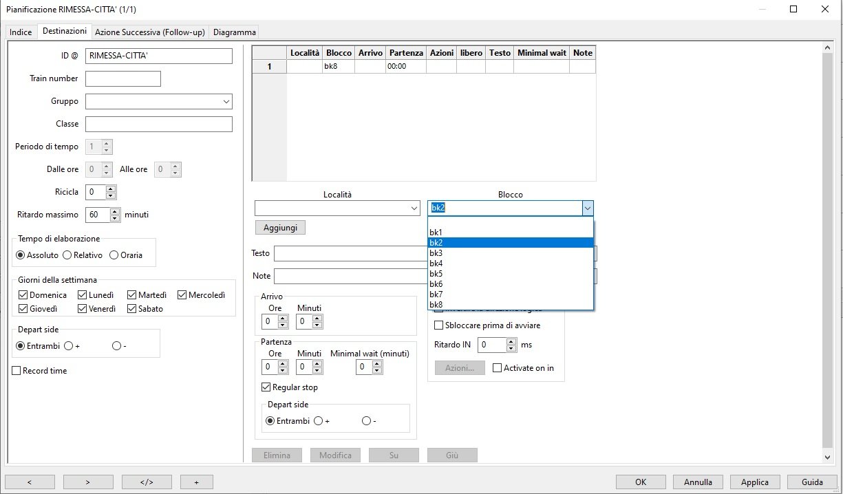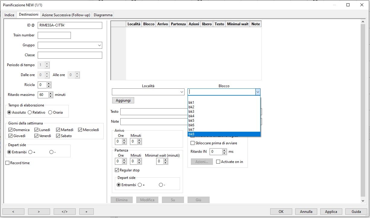 Diamo un nome alla pianificazione sostituendo NEW con RIMESSA-CITTA’ e passiamo ad inserire il blocco di partenza, in questo caso “bk8”, corrispondente alla RIMESSA.