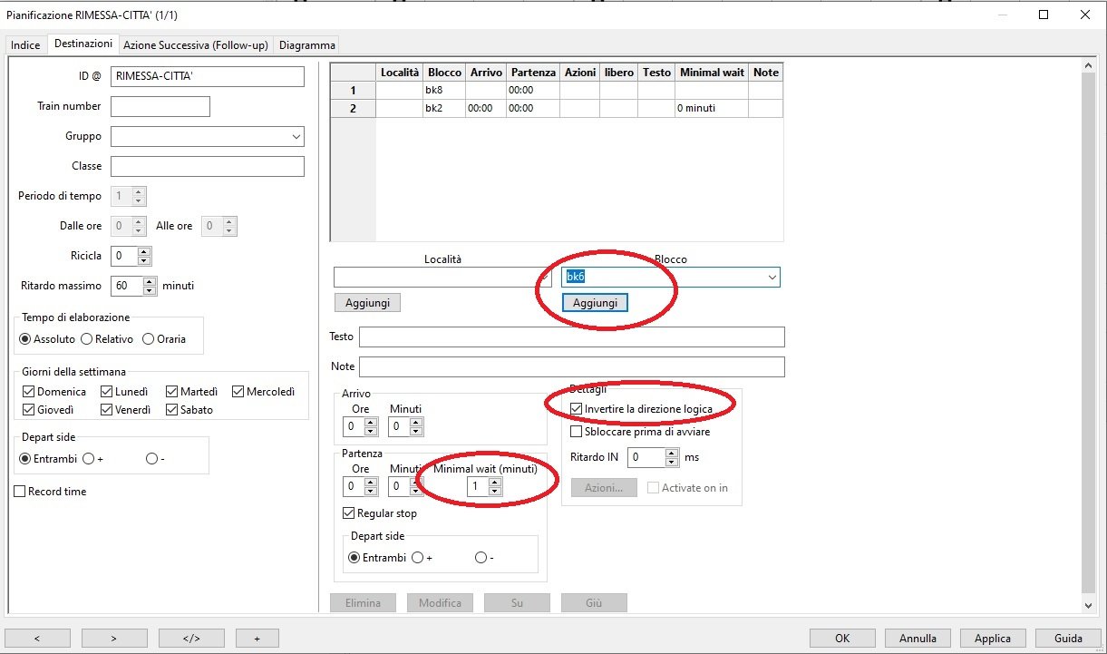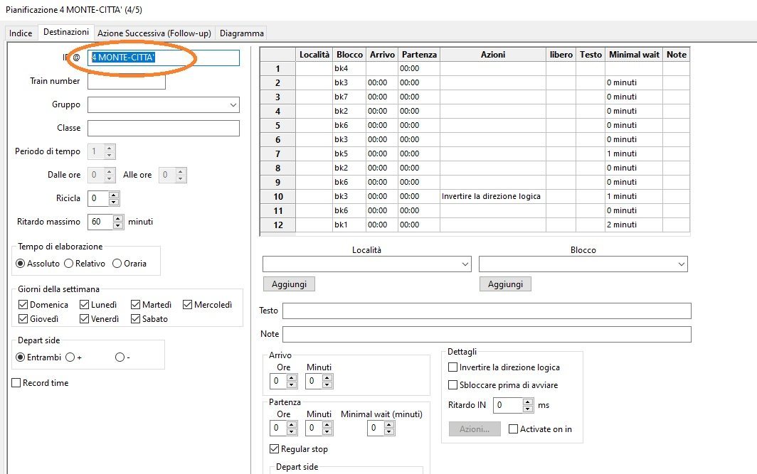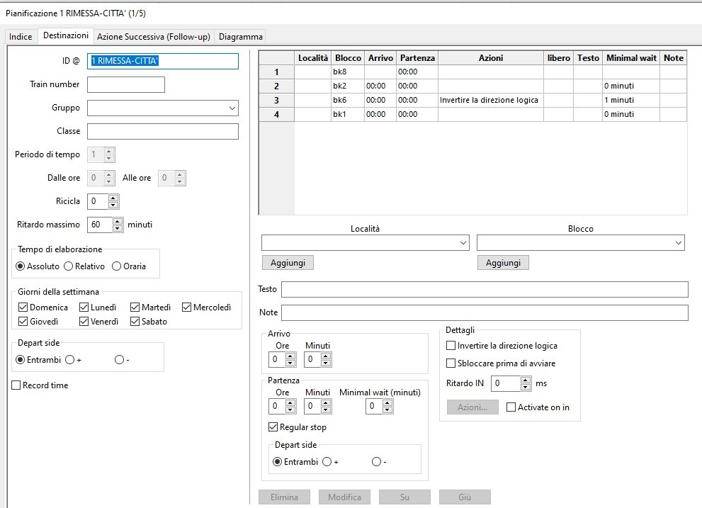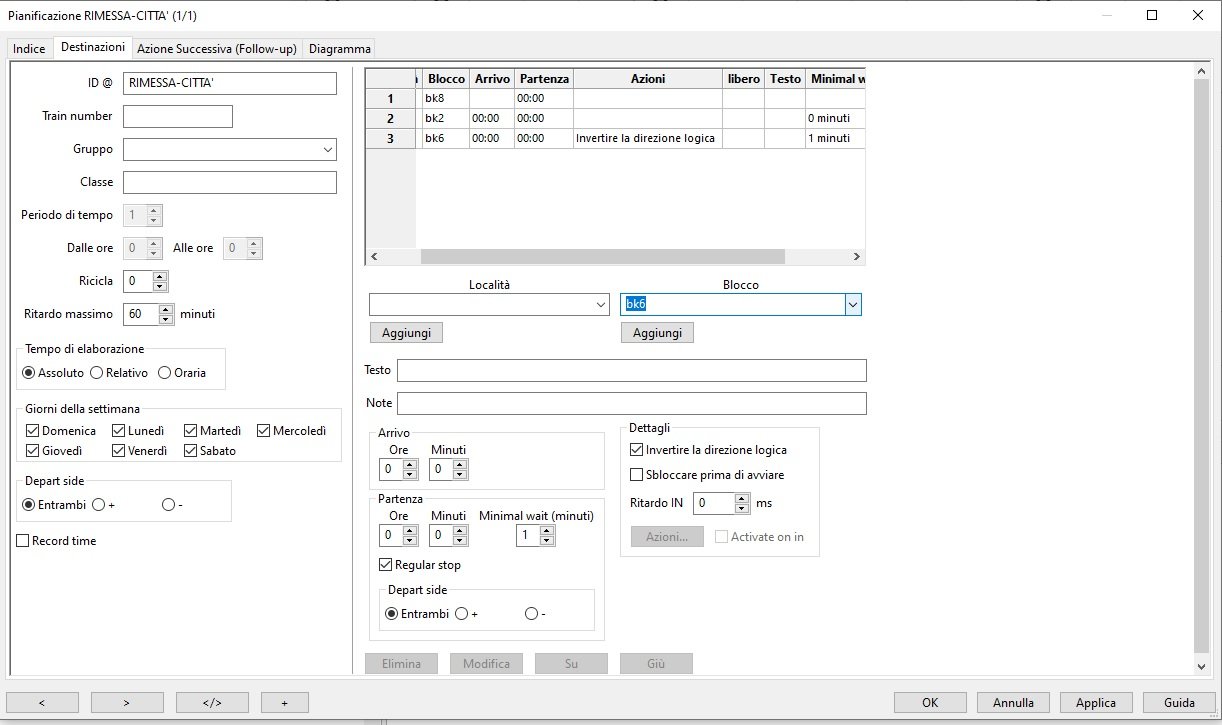 Vorrei far notare che nei blocchi configurati come “stazioni di testa” l’inversione di marcia è fatta in automatico da Rocrail e quindi non va messa nelle condizioni della pianificazione. Occorre invece mettere l’inversione di marcia là dove serve, con una breve sosta temporale, nei blocchi di normale transito.