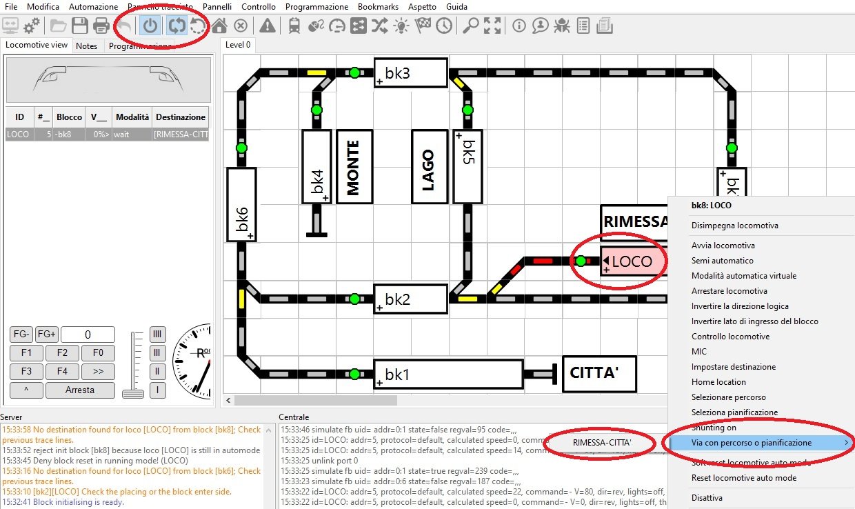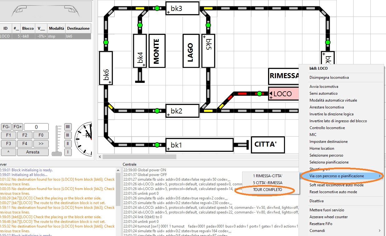 Assegniamo la loco al blocco di partenza, controlliamo la direzione di marcia, alimentazione tracciato e modalità automatica attivi, tasto destro del mouse sul blocco e scegliamo “VIA CON PERCORSO O PIANIFICAZIONE e ovviamente click su TOUR COMPLETO.