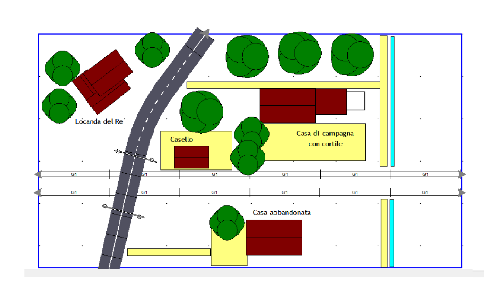 La striscia blu in origine doveva essere un canale di irrigazione di campagna ma proprio ieri guardando il modulo pensavo ad un bel fiumiciattolo con la casa di campagna limitrofa al corso d'acqua.