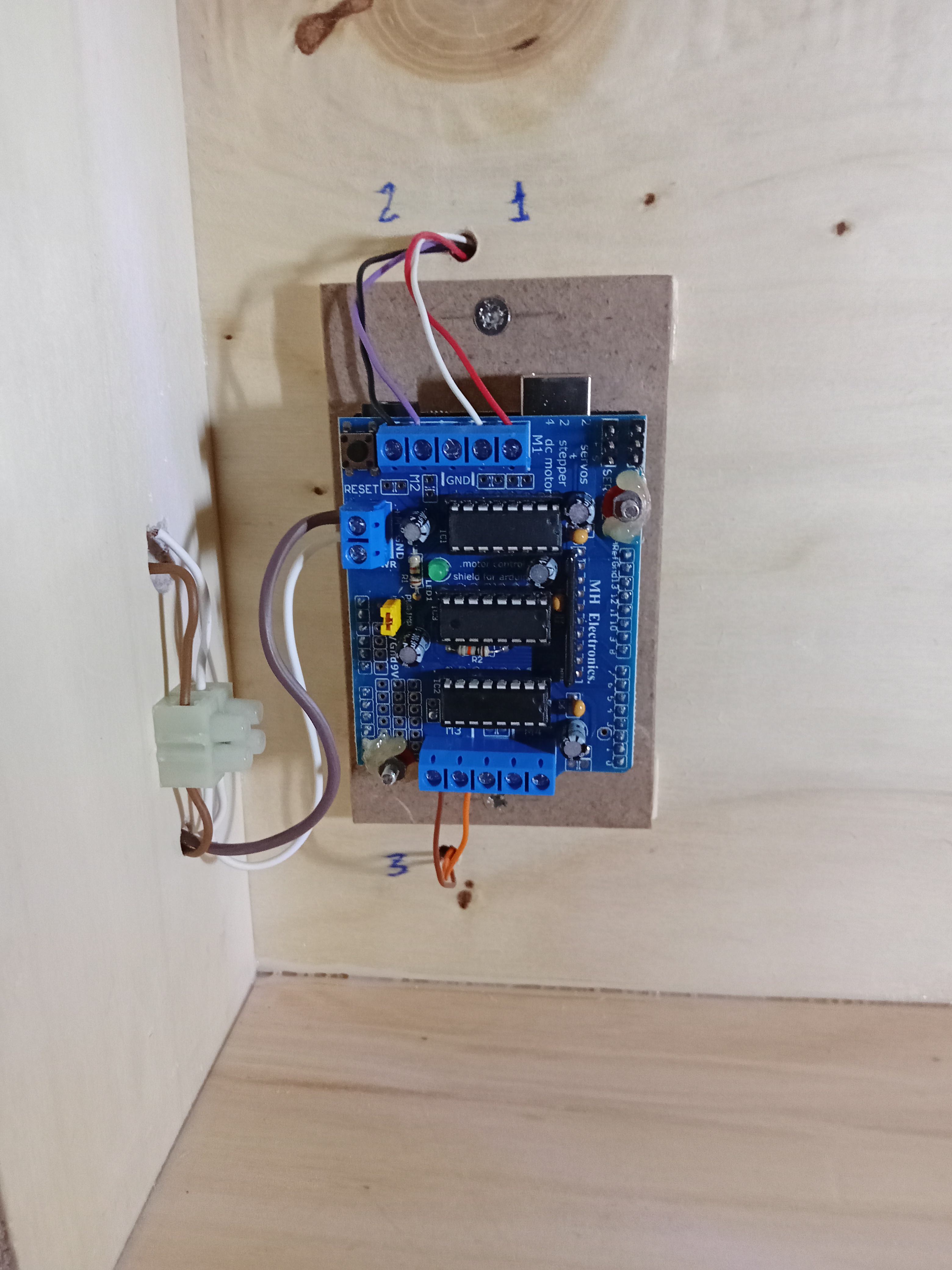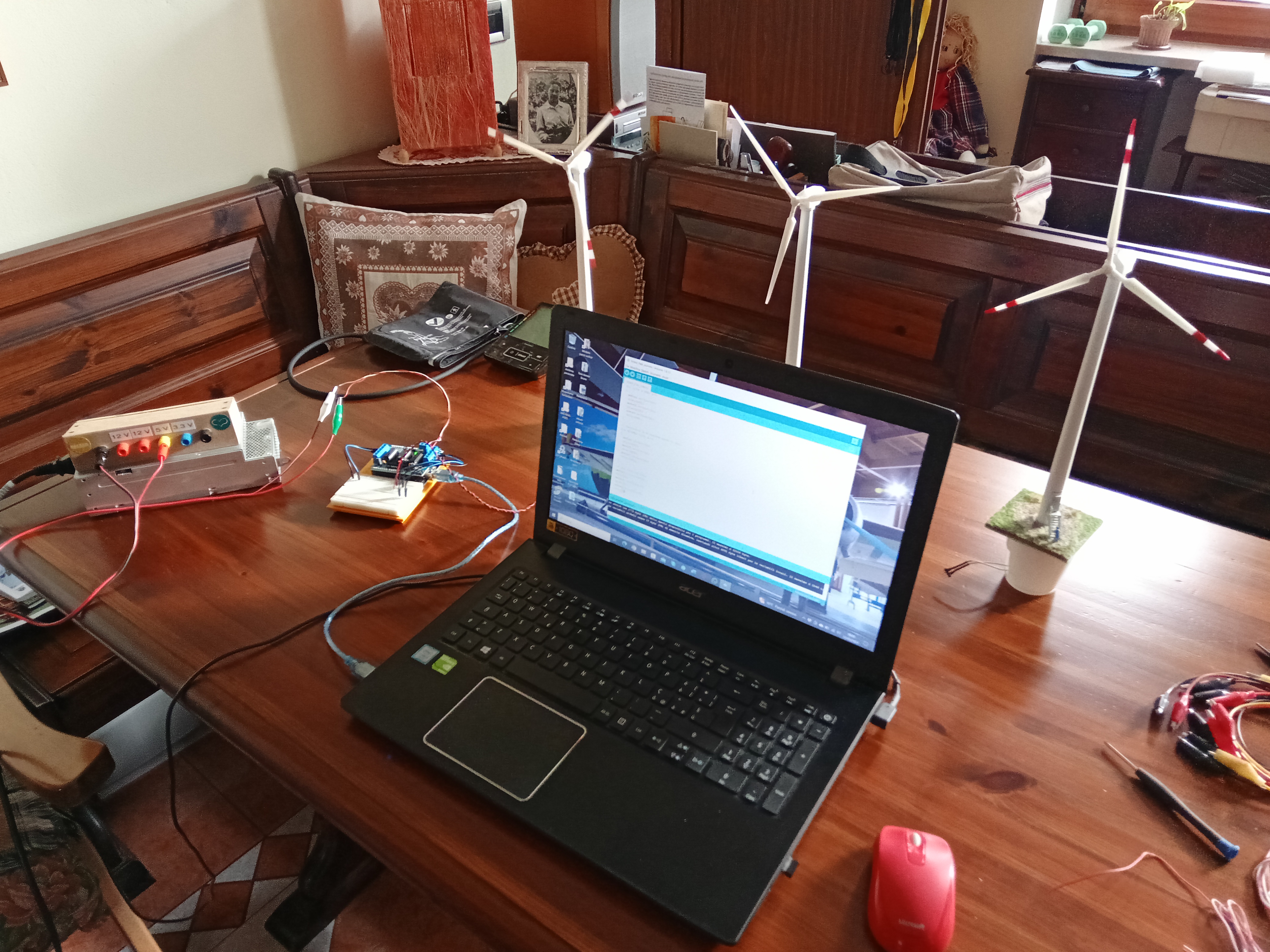 Questo mi ha permesso di aggiornare tutto l'impianto elettrico e di inserire nel modulo una scheda Arduino con motor shield per poter controllare avvio, spegnimento e velocità delle pale in automatico (in base al programma, "sketch" scritto e caricato su Arduino). In questo modo il movimento delle pale si avvicina di più al vero: movimento lento, avvio e spegnimento indipendente...