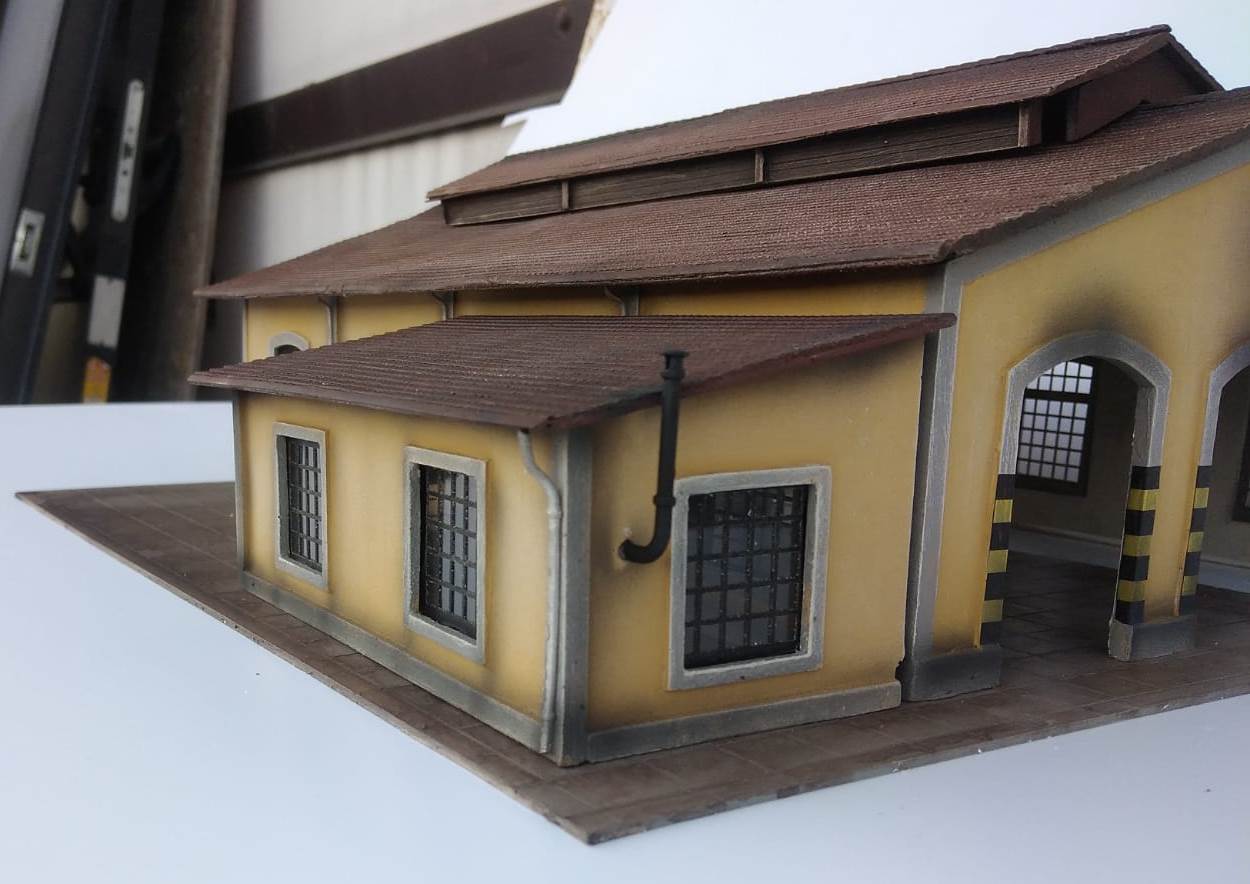 Si tratta di una rimessa locomotive a tre stalli delle FS con annessa officina, realizzata in resina con le finestre in fotoincisione.
