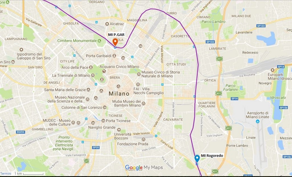 Circa 45 minuti dopo la partenza da Torino Porta Susa il treno si appresta ad entrare nel nodo di Milano, quindi attraversiamo le stazioni di Rho Fiera, Milano Certosa e Milano Villapizzone, per arrivare in orario a Milano Porta Garibaldi. A differenza della maggior parte dei treni "Frecciarossa", questo treno non effettua la fermata di Milano Centrale, ma attraversa il nodo di Milano passando per Porta Garibaldi e Rogoredo, in modo da servire anche queste due importanti stazioni che raccolgono un vasto bacino di utenza dalle zone nord-ovest e sud di Milano. Entrambe le stazioni sono facilmente raggiungibili sia con i mezzi del trasporto pubblico locale che con gli altri treni Regionali e Suburbani provenienti dal vasto hinterland circostante.