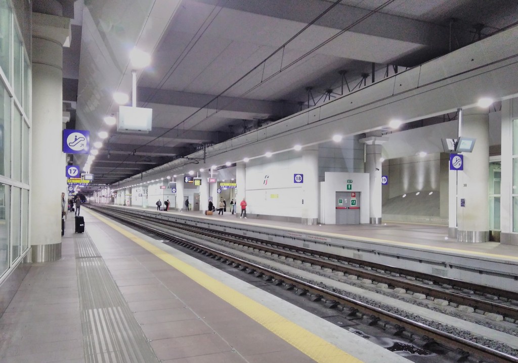 Nella stazione di Bologna Centrale attendo il treno Italo 9932 per Torino, previsto alle 16:03. Leggo sui tabelloni delle partenze che il treno ferma al binario 16, che è uno dei 4 binari della stazione sotterranea, quella destinata ai treni ad alta velocità. Raggiungere i binari 16-17-18 e 19 non è del tutto intuitivo, quindi occorre organizzarsi per tempo, anche se i treni vengono annunciati con congruo anticipo e seguendo le indicazioni è possibile raggiungere senza troppe difficoltà la stazione sotterranea. I locali della stazione sotterranea sono dotati di servizi, aree di attesa e bar.