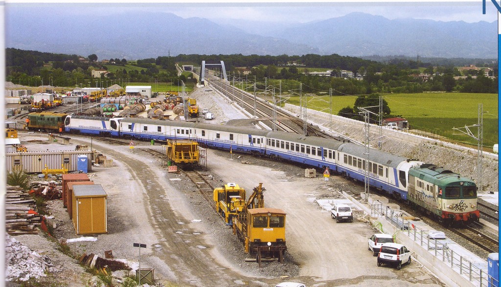 In foto è possibile vedere parte del cantiere di San Pietro a Sieve e il breve tratto di ferrovia AV all'aperto tra le gallerie Vaglia e Morticine. In questa immagine, il treno Archimede di Rete Ferroviaria Italiana, viene inoltrato sulla linea AV per prove e misure. Il treno è giunto in quel luogo proprio attraverso al linea Faentina, che si raggiunge con il raccordo provvisorio. La foto è stata scattata nel Maggio 2008, mentre la linea AV Bologna-Firenze fu aperta nel 2009.